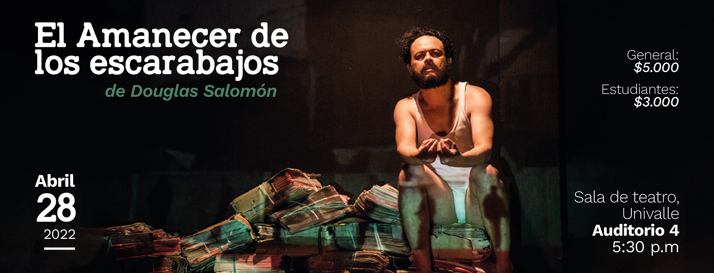El amanecer de los escarabajos, bajo la dirección de Douglas Salomón, es una teatralidad en el campo expandido, que desplaza los niveles narrativos hacia una performatividad, intensificando la presencia de los cuerpos y su simultaneidad: por un lado, el flujo de conciencia de D.S. y por otro lado el despliegue de un archivo que se proyecta a lo largo de la pieza a través de la figura de un Video-escarabajo.