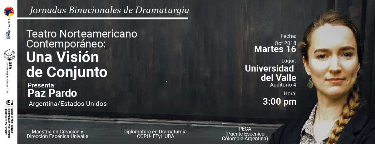 En el marco de las JORNADAS BINACIONALES DE DRAMATURGIA, un espacio creado entre dos programas universitarios latinoamericanos en teatro: la Diplomatura en Dramaturgia del Centro Cultural Paco Urondo de la Universidad de Buenos Aires, Argentina, y la Maestría en Creación y Dirección Escénica del Departamento de Artes Escénicas de la FAI, de la Universidad del Valle, está programada la presencia de la maestra Paz Pardo (Argentina- Estados Unidos) con la conferencia “Teatro norteamericano contemporáneo: una visión de conjunto”, que se llevará a cabo en la sala de teatro Univalle, este martes 16 de octubre a las 3.00 pm.