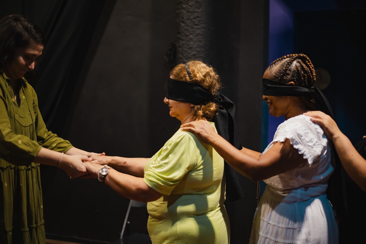 Lina María Ramírez con dos participantes del taller Arteridad: teatro sensorial con familiares de personas desaparecidas