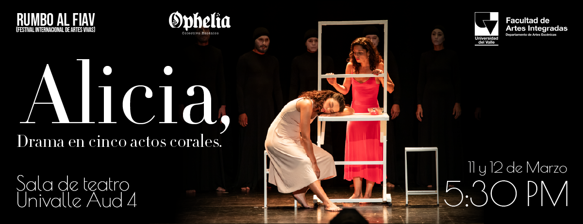 El Departamento de Artes Escénicas de la Universidad del Valle continúa su temporada especial Rumbo al FIAV (Festival Internacional de Artes Vivas) con la presentación de la obra Alicia, drama en cinco actos corales, bajo la dirección de Natalia Gil. La función se realizará el 10 de marzo, a las 5:30 p. m. En la Sala de Teatro Univalle (Auditorio 4). Este montaje hace parte de la serie de propuestas escénicas que integran esta programación especial previa al festival.