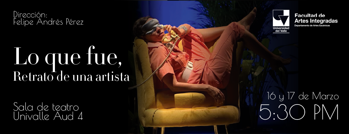 El Departamento de Artes Escénicas de la Universidad del Valle continúa su temporada especial Rumbo al FIAV (Festival Internacional de Artes Vivas) con su última función, la obra: Lo que fue, Retrato de una artista. Las funciones se realizarán los días 16 y 17 de marzo, a las 5:30 p. m., en la Sala de Teatro Univalle (Auditorio 4). Este montaje hace parte de la serie de propuestas escénicas que integran esta programación especial previa al festival, consolidando un espacio de exhibición para la creación contemporánea y la exploración escénica dentro de la Facultad de Artes Integradas.