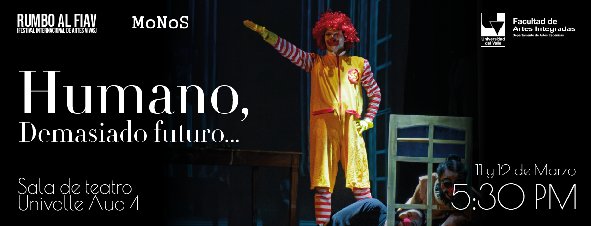 El Departamento de Artes Escénicas de la Universidad del Valle continúa su temporada especial Rumbo al FIAV (Festival Internacional de Artes Vivas) con la presentación de la obra Humano, Demasiado futuro…, del colectivo MoNoS. Las funciones se realizarán los días 11 y 12 de marzo, a las 5:30 p. m., en la Sala de Teatro Univalle (Auditorio 4). Este montaje hace parte de la serie de propuestas escénicas que integran esta programación especial previa al festival, consolidando un espacio de exhibición para la creación contemporánea y la exploración escénica dentro de la Facultad de Artes Integradas.