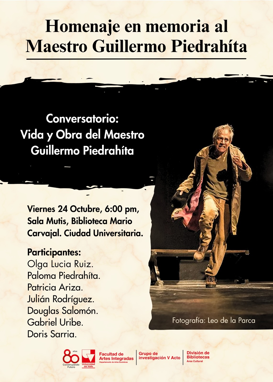 El Departamento de Artes Escénicas invita al público caleño al conversatorio: Vida y Obra del Maestro Guillermo Piedrahita, en memoria a un artista, colega, y amigo del Departamento y de la comunidad artística caleña y colombiana. El conversatorio tendrá lugar este viernes 24 de octubre en la Sala Mutis de la Biblioteca Mario Carvajal de la Universidad del Valle, a las 6 p.m.