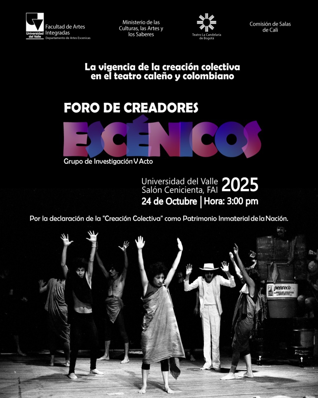El Departamento de Artes Escénicas invita al público caleño al Foro de Creadores Escénicos, para marcar la declaración de la "Creación Colectiva" como Patrimonio Inmaterial de la Nación. El foro tendrá lugar este viernes 24 de octubre en el Salón Cenicienta (Salón 2025), Nueva FAI, a las 3 p.m.