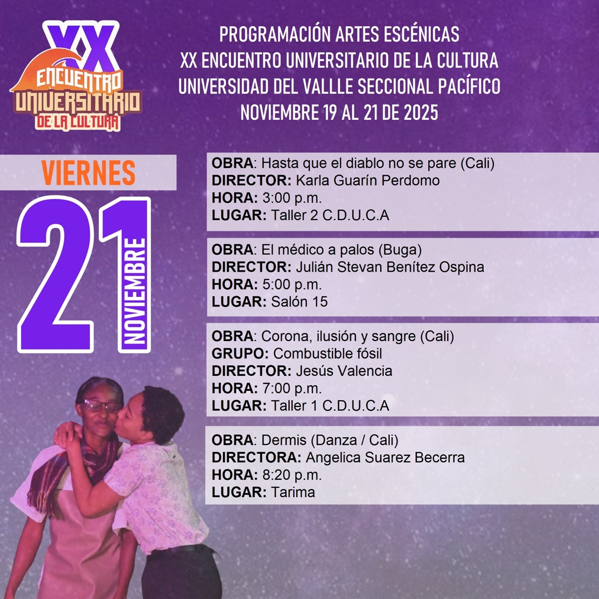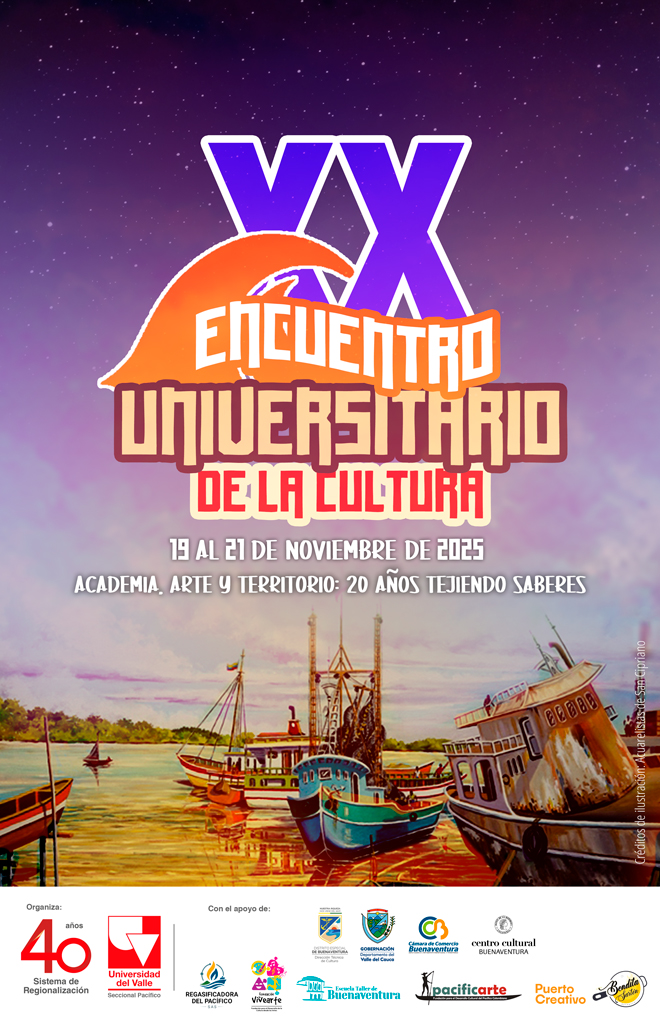 El Encuentro, que se realizará del 19 al 21 de noviembre de 2025, reunirá a universidades, colectivos artísticos, gestores culturales y sabedores del Pacífico y de otras regiones del país, bajo el lema “Academia, Arte y Territorio: 20 años tejiendo saberes”. El XX Encuentro Universitario de la Cultura reafirma su compromiso con la construcción de un territorio donde el arte y el conocimiento se entrelazan para transformar realidades y proyectar al Pacífico colombiano como un epicentro de creación, reflexión y convivencia. El evento cuenta con el apoyo de: Vicerrectoría de Bienestar Universitario, Vicerrectoría de Regionalización, Alcaldía Distrital de Buenaventura (Dirección Técnica de Cultura), Gobernación del valle del Cauca, Cámara de Comercio de Buenaventura, Centro Cultural del Banco de la República, Fundación Pacificarte, Fundación ViveArte, Escuela Taller de Buenaventura, Puerto Creativo, Regasificadora del Pacífico S.A.S., y Bendita Sartén.
