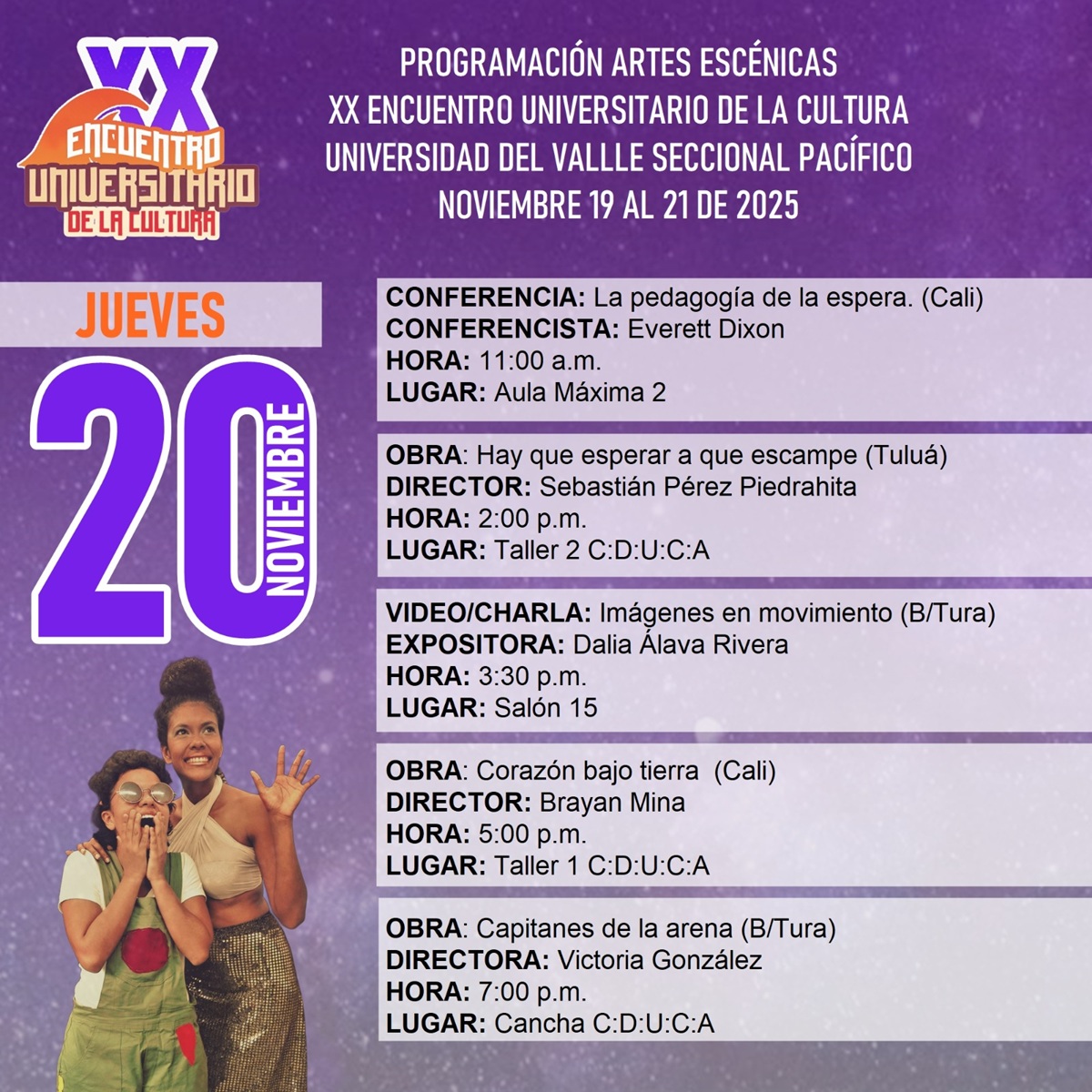 El Departamento de Artes Escénicas invita a uno de los eventos más importantes, “Academia, Arte y Territorio: 20 años tejiendo saberes”. El evento se realizará del 19 al 21 de noviembre de 2025 en diferentes espacios de la Seccional Pacífico de Univalle en Buenaventura. Este encuentro está organizado por la Universidad del Valle Seccional Pacífico, con el acompañamiento de aliados institucionales, medios de comunicación, estudiantes, funcionarios y comunidad en general. La programación de artes escénicas se puede consultar a continuación en esta página, y la programación completa del encuentro se puede descargar aquí.
