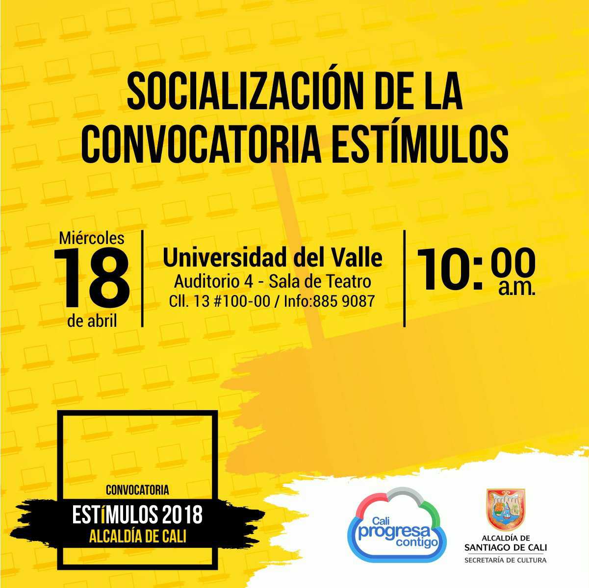 La Alcaldía de Cali hará una socialización de la Convocatoria Estímulos en la Sala de Teatro Univalle (Auditorio IV) el 18 de abril 2018.