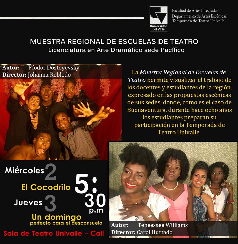 La MUESTRA REGIONAL DE ESCUELAS DE TEATRO permite visualizar el trabajo de los docentes y estudiantes de la región, expresado en las propuestas escénicas de sus sedes, donde, como es el caso de Buenaventura, durante hace siete años los estudiantes preparan su participación en la TEMPORADA DE TEATRO UNIVALLE.