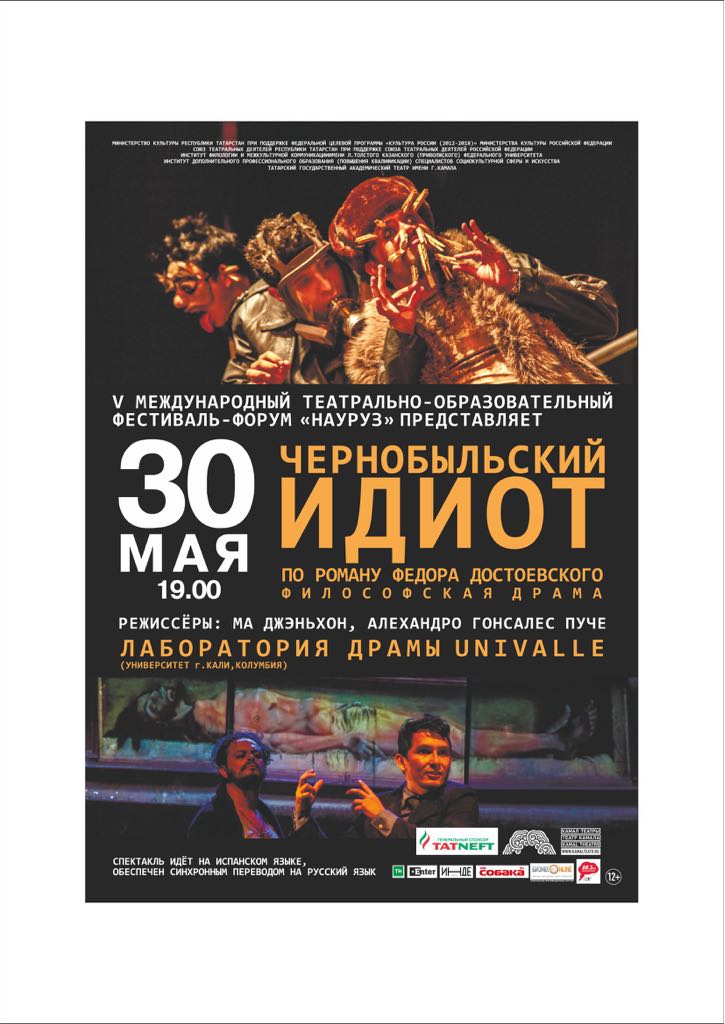 El Idiota de Chernóbil, es una puesta en escena, con un texto colectivo, a partir de la novela El Idiota de Fiódor Dostoievski y apoyada en disímiles fuentes como Voces de Chernóbil de la Premio Nóbel Svetlana Alexiévich. Chernóbil estremeció los cimientos de la humanidad transformando las relaciones del hombre con la naturaleza, la fe, los paradigmas de la ciencia y los referentes éticos y espirituales. A Pripiat, epicentro de la tragedia regresa, años después, el Príncipe Mishkin, y trata de reconstruir los valores espirituales de una aldea que vive en los límites de la destrucción ambiental y moral. El proyecto ha sido realizado gracias a la Convocatoria Interna Para Proyectos de Creación Artística y Humanística 2016, de la Universidad del Valle, y ha participado en prestigiosos festivales como Brújula al Sur e Iberoamericano de Bogotá.