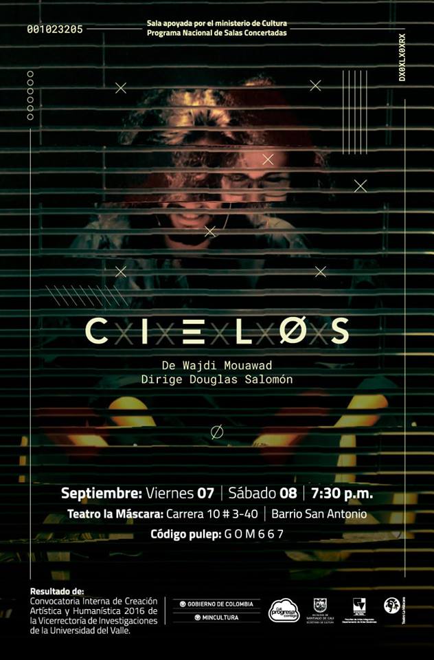 La obra Cielos, dirigida por el docente y director de la Licenciatura de la Licenciatura en Arte Dramático de la Universidad del Valle, Douglas Salomón, se estará presentando los días 7 y 8 de septiembre en la Temporada del Teatro La Máscara, de Cali.