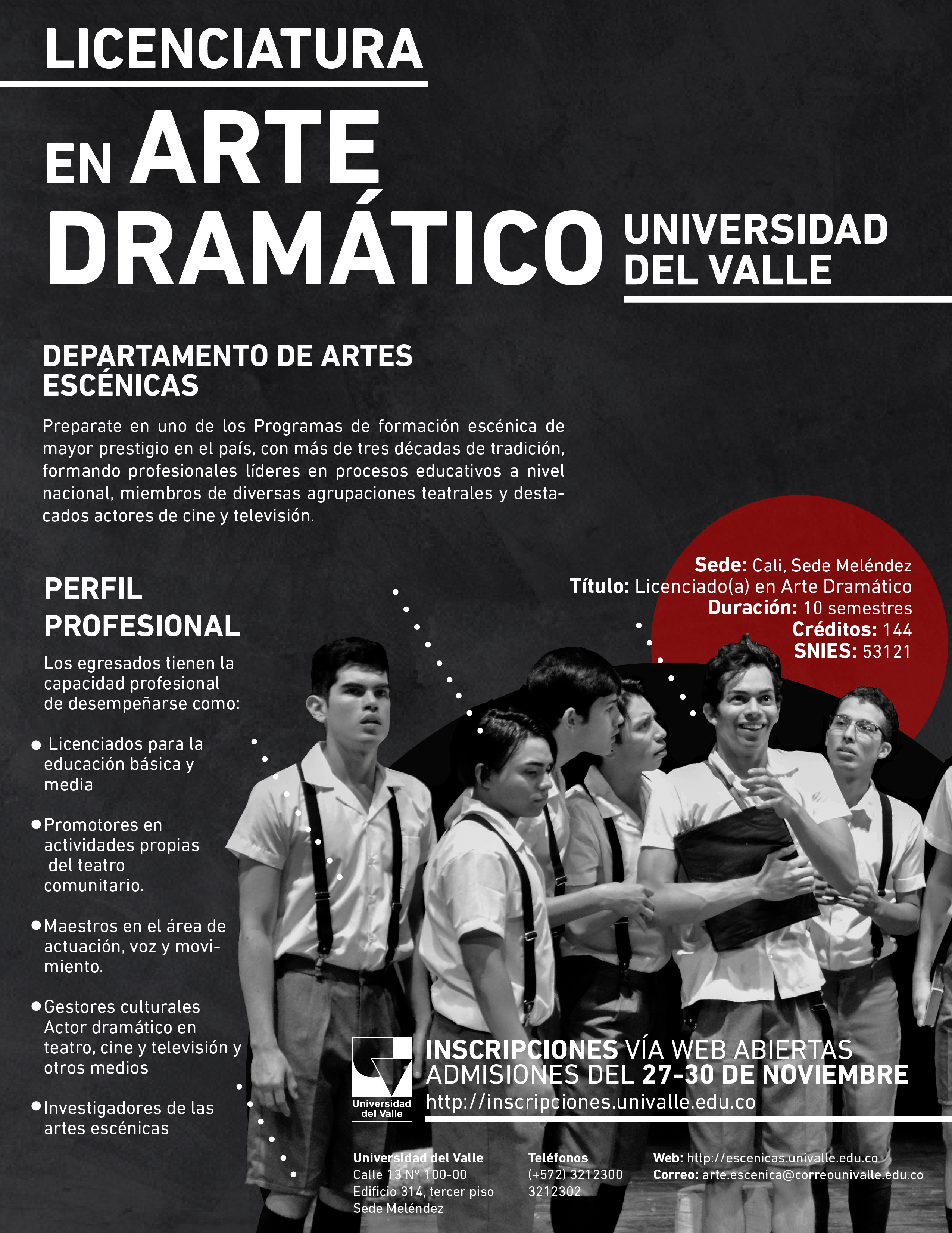 El Departamento de Artes Escénicas de la Universidad del Valle, como todos los semestres, invita a los jóvenes interesados a ingresar al programa de Licenciatura en Arte Dramático, programa que recibió la Acreditación de Alta calidad, el 30 de septiembre de 2015, por un periodo de 4 años. Las inscripciones vía web están abiertas desde el 27 al 30 de Noviembre de 2018.