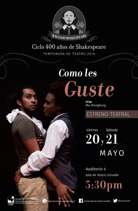 El Departamento de Artes Escénicas programa El Ciclo 400 años de Shakespeare como parte de la conmemoración mundial de uno de los mas grandes dramaturgos de todos los tiempos, con títulos como “Sueño de una noche de verano” con estudiantes de la Licenciatura de Arte Dramático de Buenaventura y ahora con el estreno de la comedia “Como les guste” dirigida por la maestra Ma Zhenghong, quien ha llevado a escena obras del mismo autor como: “El mercader de Venecia” y “El Rey Lear”. La obra será representada por estudiantes de la Licenciatura en Arte Dramático de la Universidad del Valle.