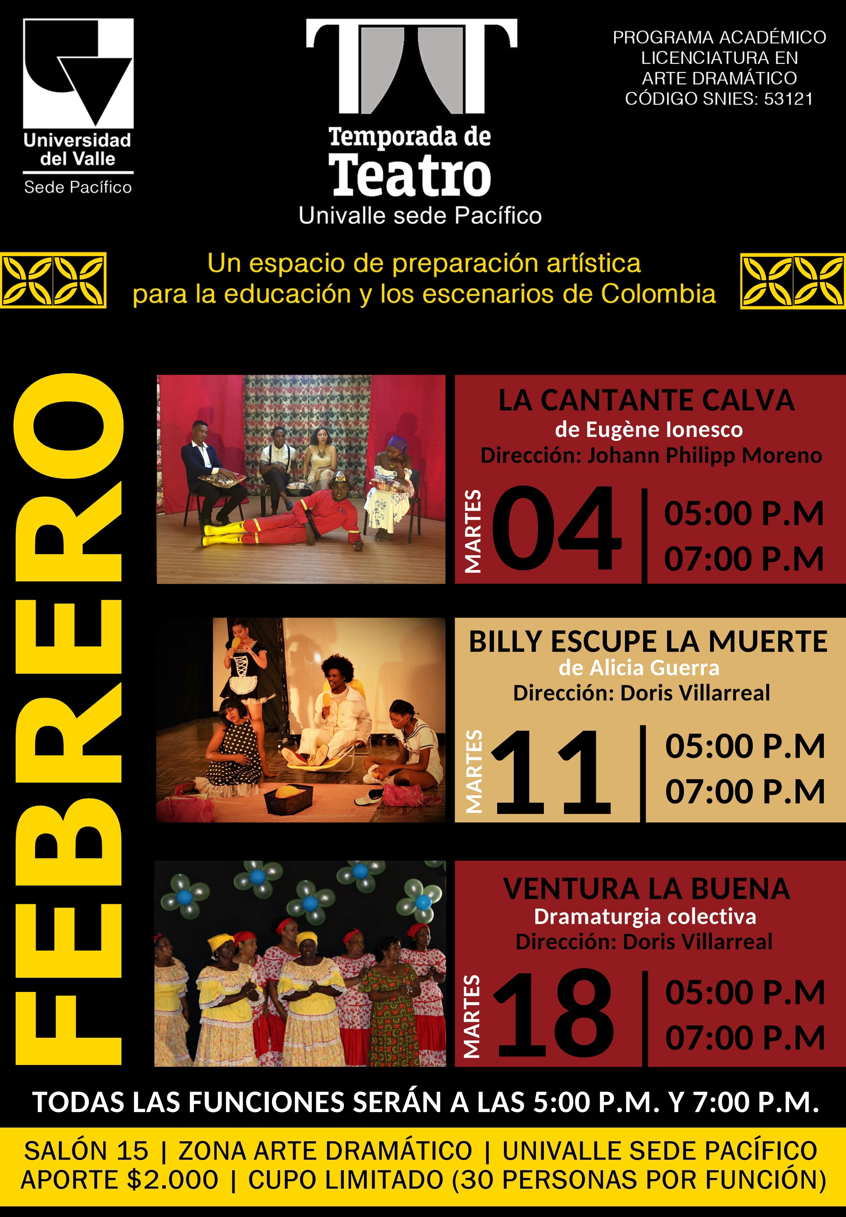 Con el estreno de la obra "La Cantante Calva" del dramaturgo franco - rumano Eugéne Ionesco, interpretada por estudiantes de sexto semestre y bajo la dirección del maestro Johann Phillipp Moreno, regresa nuestra tradicional temporada de teatro para celebrar lo mejor del arte escénico en Buenaventura. Un espacio creado para visibilizar el talento de nuestros jóvenes estudiantes, y para ofrecerle a la comunidad un espacio de sano esparcimiento donde, por medio de la diversión, se llegue a la reflexión; la temporada de teatro corresponde a la política de extensión de la Universidad del Valle y pretende fortalecer la creación de públicos para los espectáculos teatrales en el Pacífico colombiano.