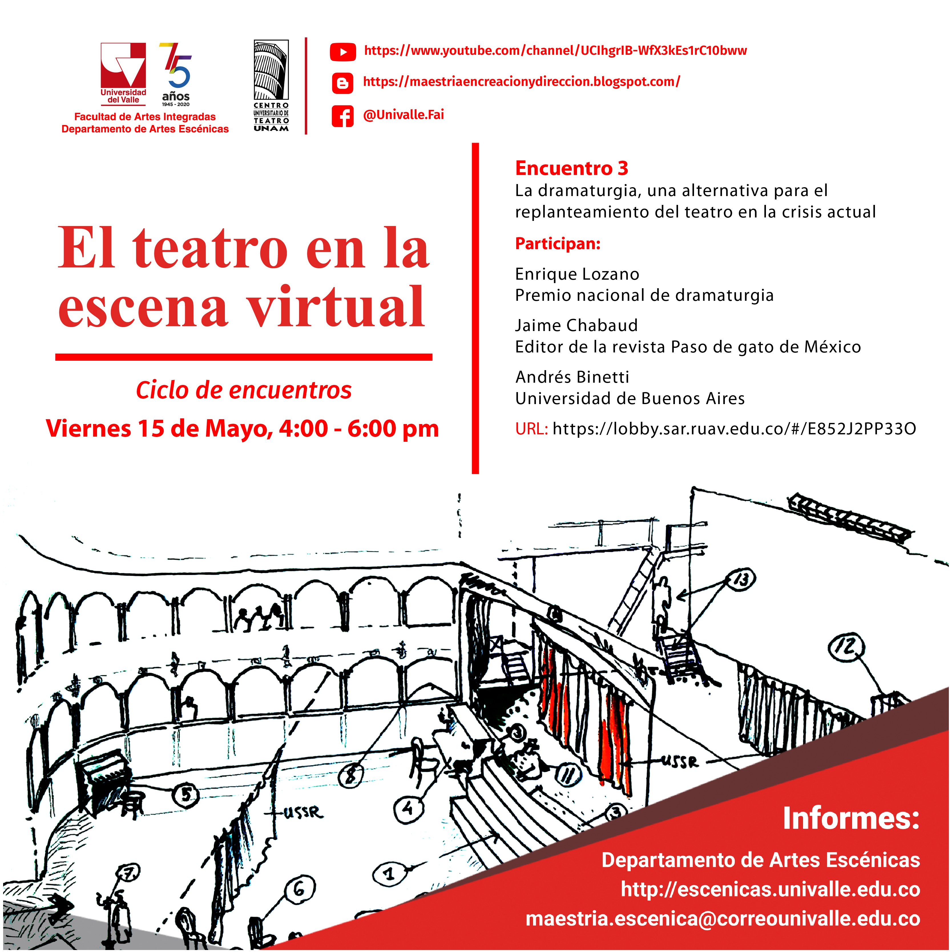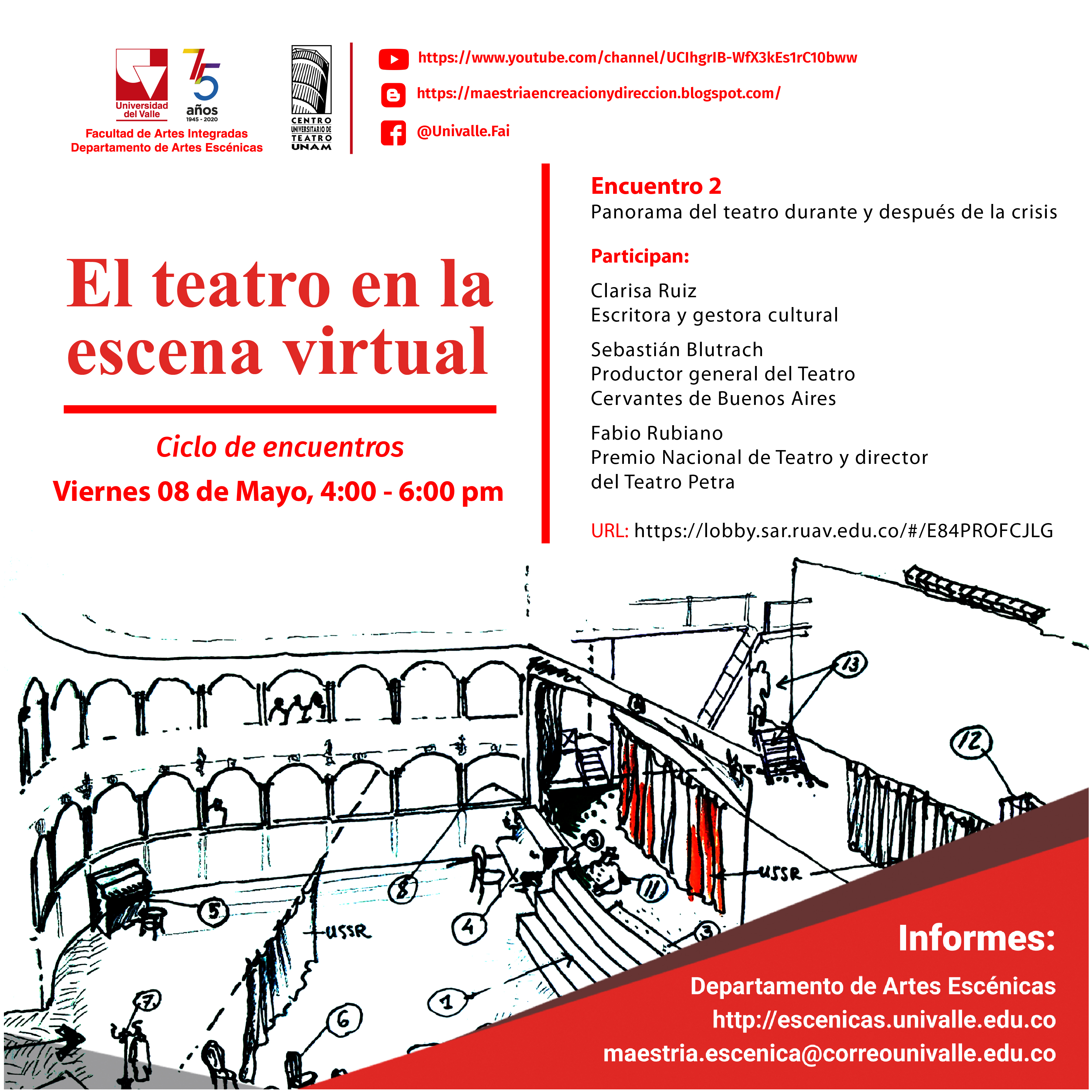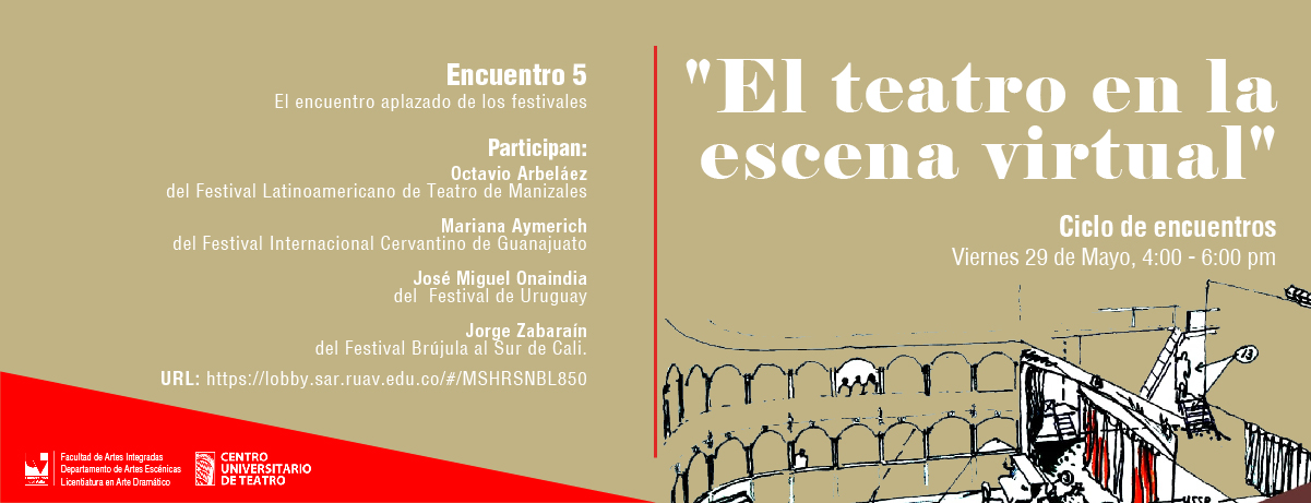 La Maestría en Creación y Dirección Escénica del Departamento de Artes Escénicas de la FAI, en conjunto con el Centro Universitario de Teatro de la Universidad Nacional Autónoma de México, continúa con el ciclo de encuentros denominado “El teatro en la escena virtual”, un espacio para reflexionar desde diferentes ángulos, el futuro del teatro y la educación artística dentro de la actual coyuntura. Con la presencia de prestigiosos docentes, directores, productores, actores y coreógrafos, los siguiente cuatro encuentros abordarán diversos aspectos neurálgicos de las artes escénicas, uno de los sectores mas impactados por la crisis actual.