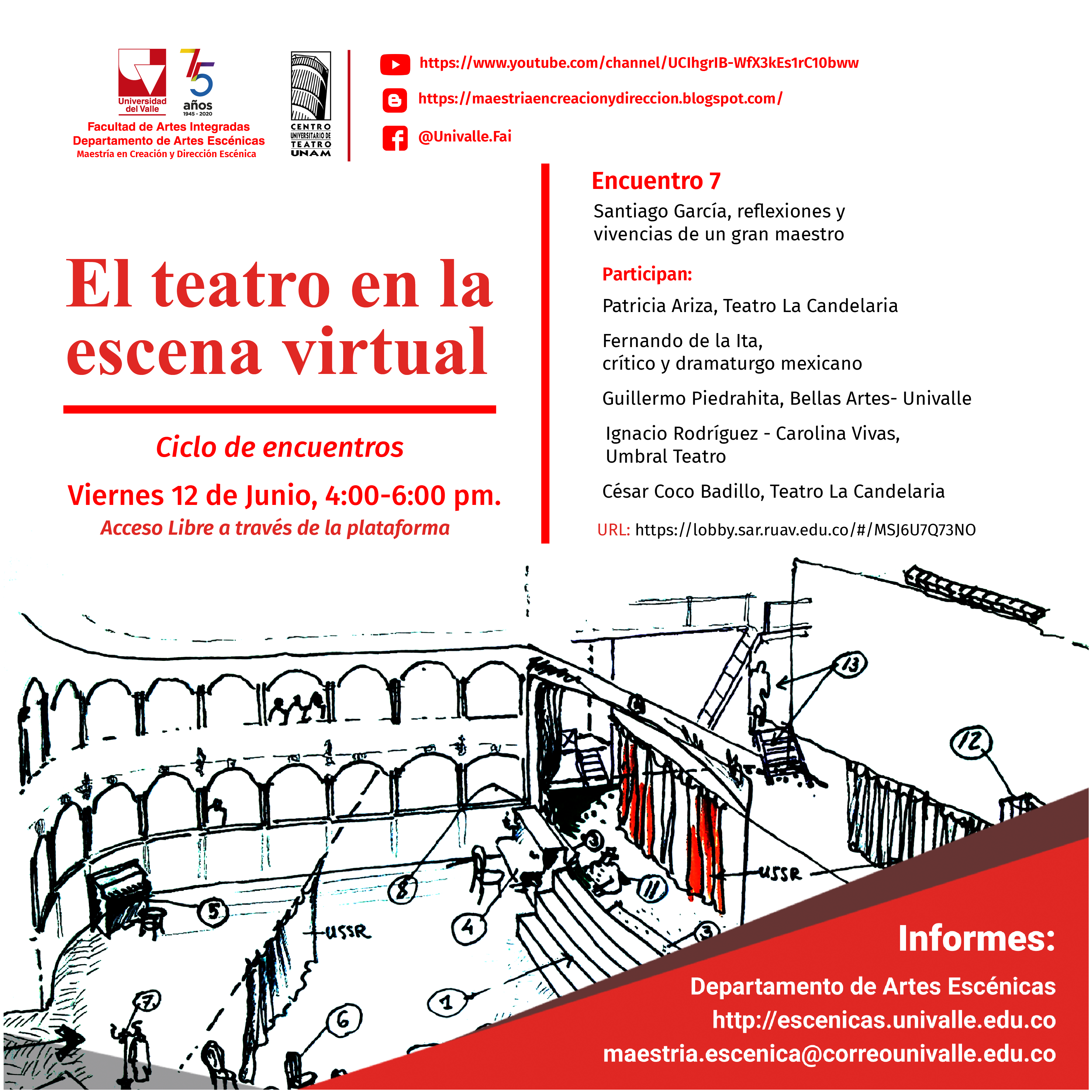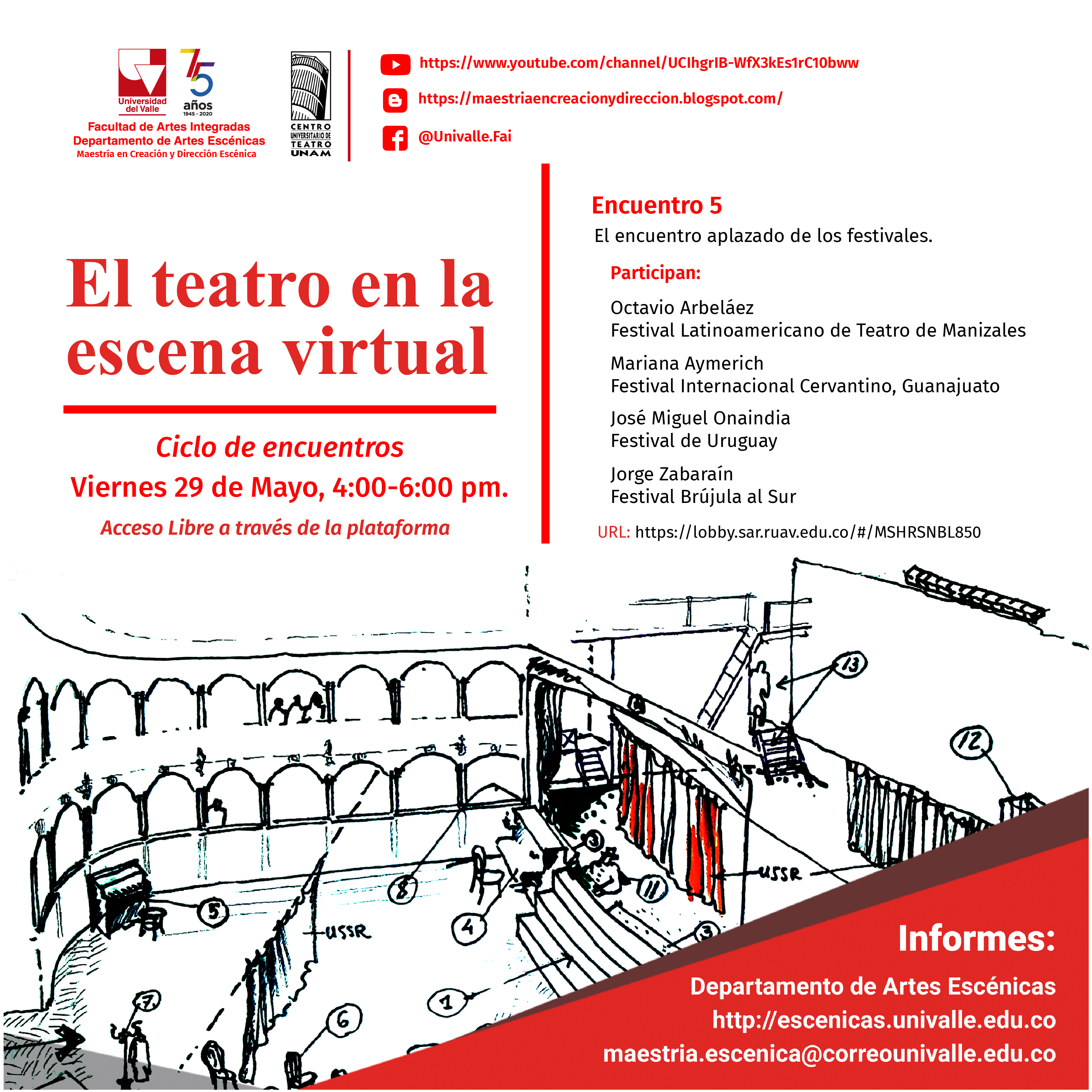 Los encuentros son de ACCESO LIBRE a través de la plataforma ZOOM y vinculándose a través de los links señalados. Posteriormente pueden apreciar los encuentros en el carnal de You Yube de la Maestría en Creación y Dirección Escénica