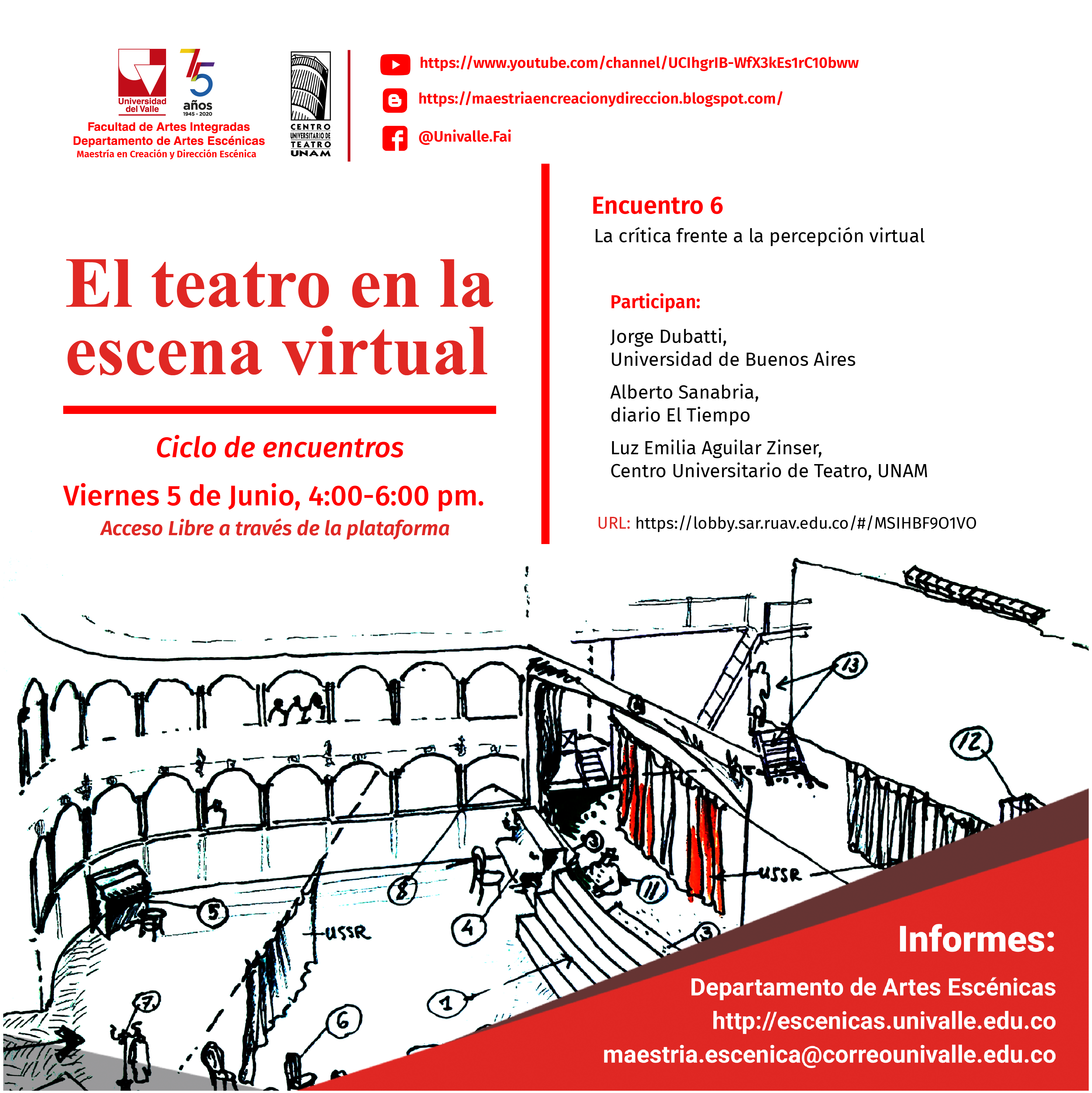 El encuentro es de ACCESO LIBRE a través de la plataforma ZOOM y vinculándose a través de los links señalados, en los días indicados, de 4:00-6:00 p.m. Posteriormente será posible de apreciar en el canal de YouTube de la Maestría en Creación y Dirección Escénica.