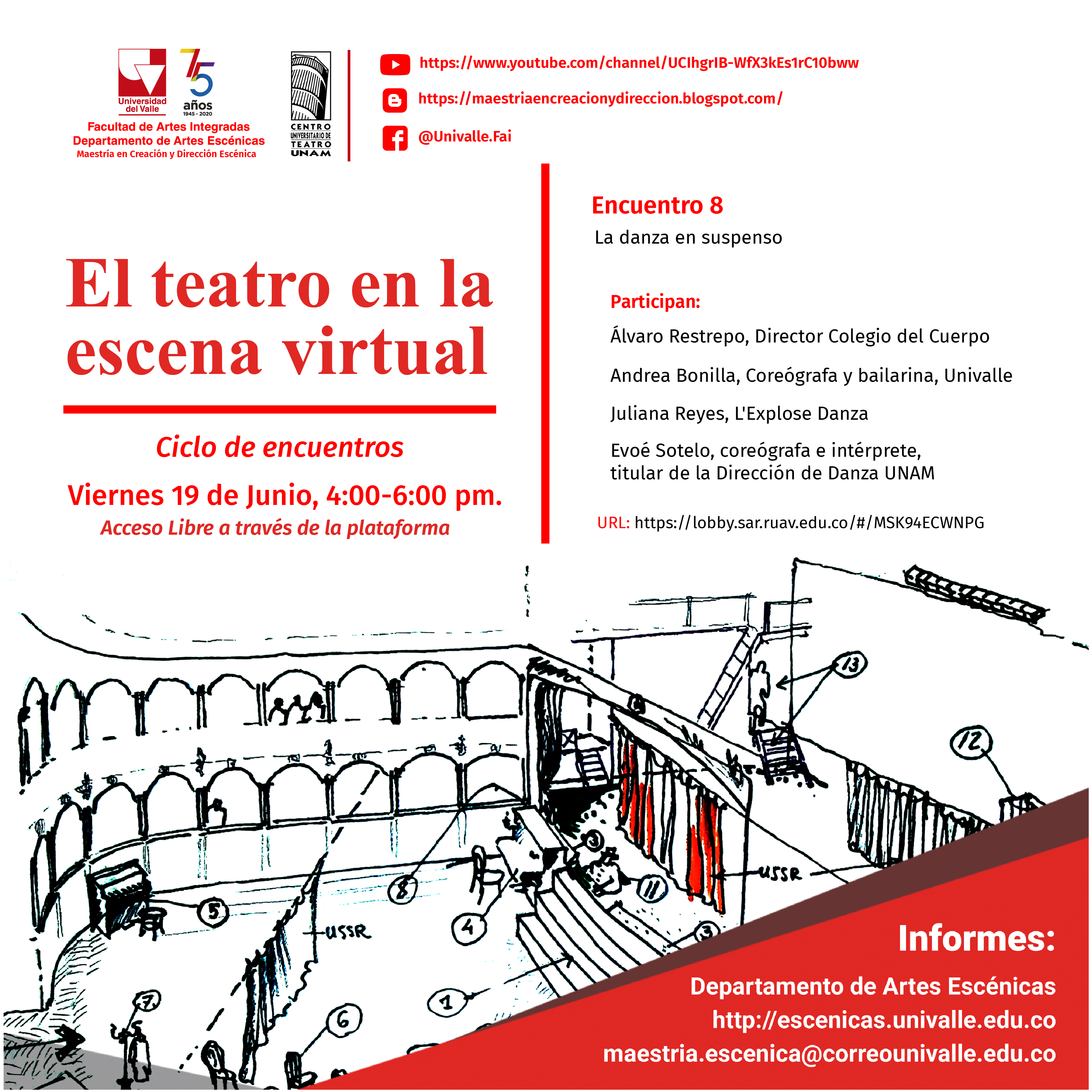 El último encuentro “La danza en suspenso”, el 19 de junio, abordará la particular encrucijada en la que se encuentra la danza y la creación coreográfica, artes que presuponen un intenso contacto físico entre los participantes de una creación. Contará con la participación del maestro Álvaro Restrepo, director del Colegio del Cuerpo de Cartagena, una de las figuras mas importantes de la danza contemporánea en Colombia; discípulo de grandes maestros como Martha Graham y Merce Cunningham, y quien es uno los pensadores mas activos sobre el papel del cuerpo, la danza y la educación artística en la sociedad; dentro de sus creaciones se encuentran: Rebis, SacrifiXio, El alma de las cosas y La noche de la hormiga. Contaremos con Juliana Reyes, dramaturga y directora de la compañía L’Explose, agrupación con cuatro candidaturas a los premios Max del 2020, en España, y una de los colectivos con mayor reconocimiento internacional, con puestas en escena como Estela, A flor de hiel, Carmina Burana y La mirada del avestruz. Por México nos acompañará Evoé Sotelo, docente e investigadora, directora de Danza de la Universidad Nacional Autónoma de México, perteneciente al colectivo Quiatora Monorriel, coreógrafa con mas de 50 creaciones escénicas entre los que se destacan Asunto Latente, Alma Daltónica, Danza Mínima, ¿Es esto un techo? y Sombrero de cinco picos. Por Univalle participará la maestra e investigadora Andrea Bonilla, coordinadora de la Licenciatura en Danza, bailarina Afro Colombiana, capoeirista, quien a lo largo de su carrera ha bailado con compañías como Andante Cayena, Cortocinesis, Corpe, Coreolab y Sankofa, entre otras.