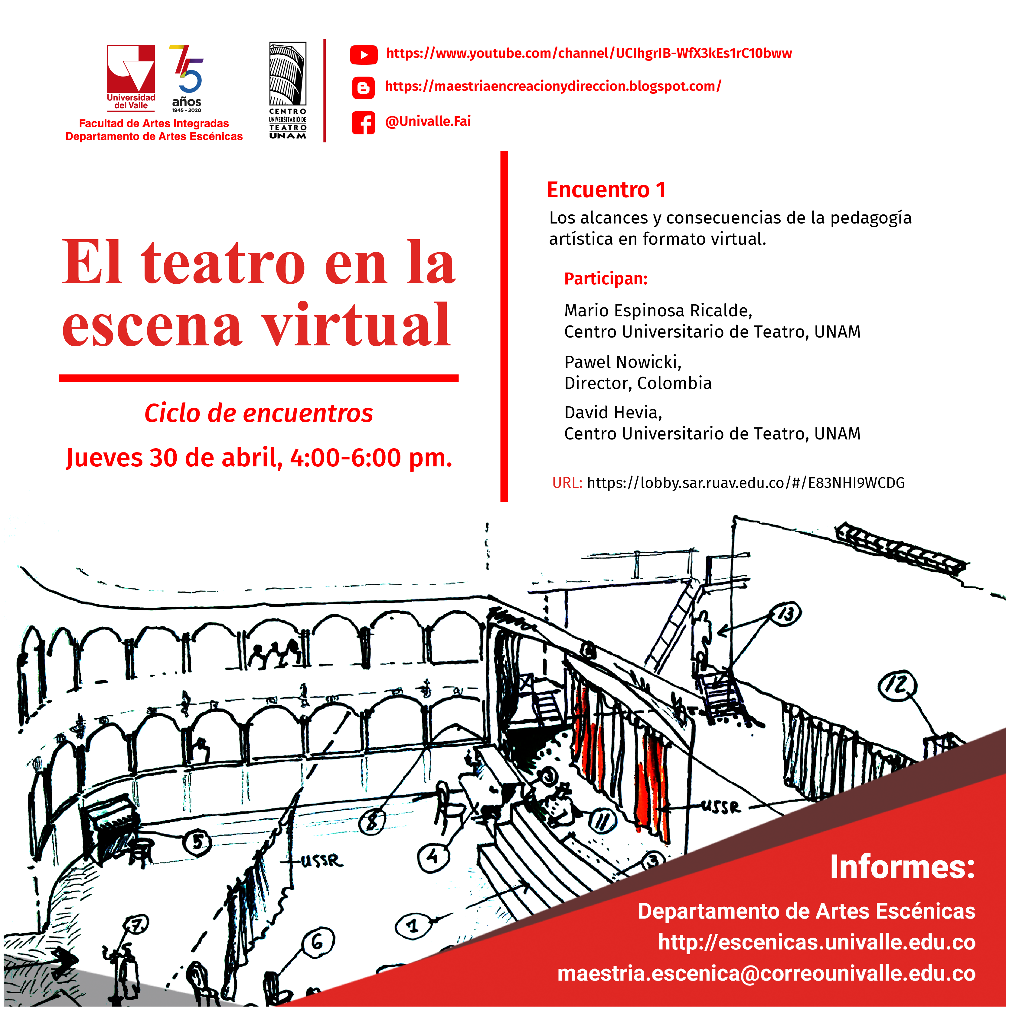 El primer encuentro, (jueves 30 de abril) se denominó “Los alcances y consecuencias de la pedagogía artística en formato virtual” con la participación de Mario Espinosa Ricalde, director el Centro Universitario de Teatro de la UNAM; Pawel Nowicki, director polaco residente en Colombia; y David Hevia, uno de los actores y docentes mas importantes de México. Este encuentro tuvo lugar con éxito, con la participación de cerca de 200 oyentes, y se puede oírlo y verlo en el siguiente link.