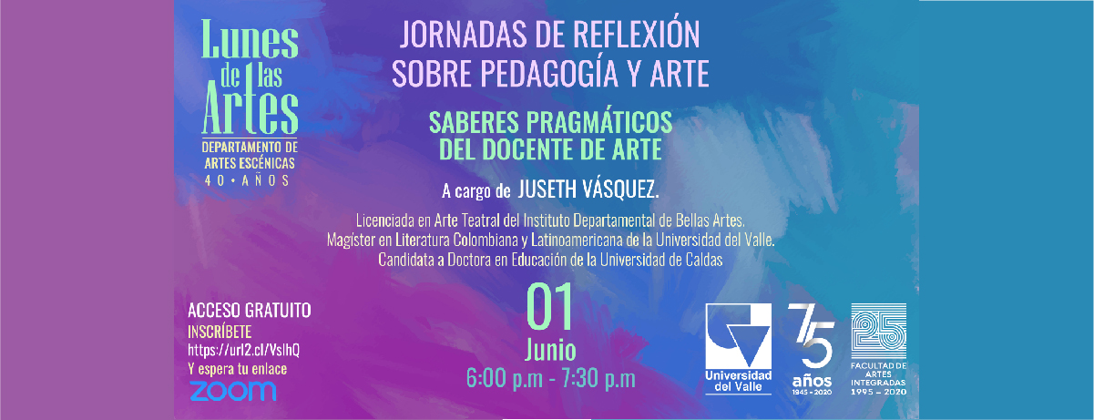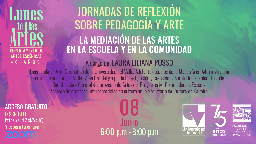 En el marco de la celebración de los 25 años de la Facultad de Artes integradas y de los 40 años del programa de Arte dramático de la Universidad del Valle, el Departamento de Artes escénicas convocó a la realización de la segunda Jornada de Reflexión sobre Pedagogía y Arte, que tuvo lugar el 8 de junio de manera virtual de 6-8 p.m. Esta segunda mesa de trabajo estuvo a cargo de Laura Liliana Posso, quien abrió la jornada con una conferencia llamada "La mediación de las artes en la escuela y en la comunidad."