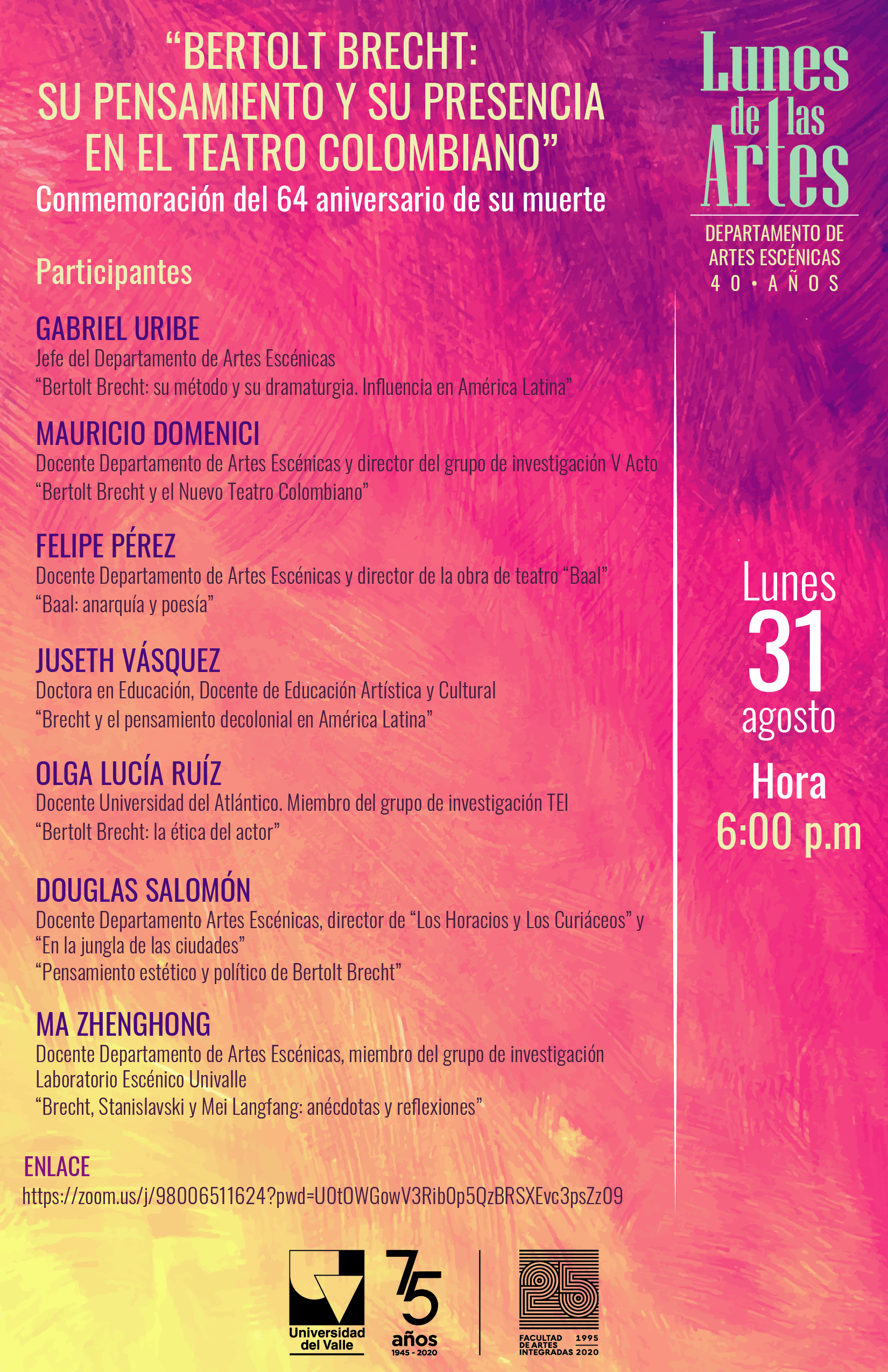 En el marco de la serie Lunes de las Artes, marcando los 40 años del Departamento de Artes escénicas y de los 75 años de la Universidad del Valle, el Departamento presenta el conversatorio "Bertolt Brecht: su pensamiento y su presencia en el teatro colombiano", una conmemoración del 64 aniversario de la muerte del dramaturgo alemán, lunes 31 de agosto a las 6 pm. Se puede acceder al evento en el siguiente link: