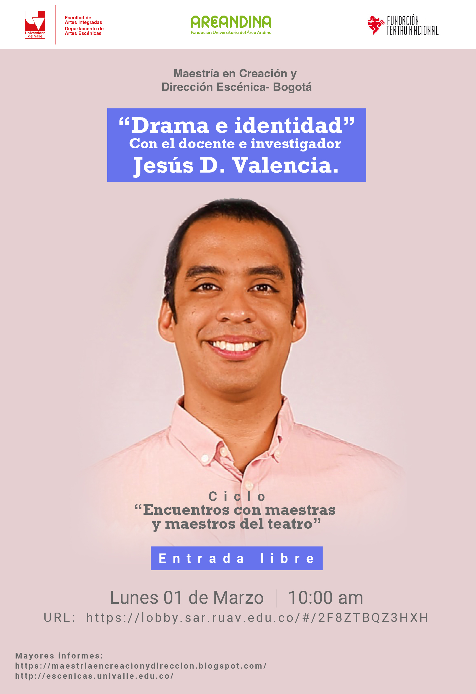 La Maestría en Creación y Dirección Escénica, Bogotá, adscrita al Departamento de Artes Escénicas de la Facultad de Artes Integradas, continúa el ciclo denominado “ENCUENTROS CON MAESTROS Y MAESTRAS DEL TEATRO”, en el 2021, abierto a la comunidad universitaria y académica, en el que participan los maestros invitados a la primera cohorte. El tercer encuentro denominado “Drama e identidad” será con el docente Jesús D. Valencia.