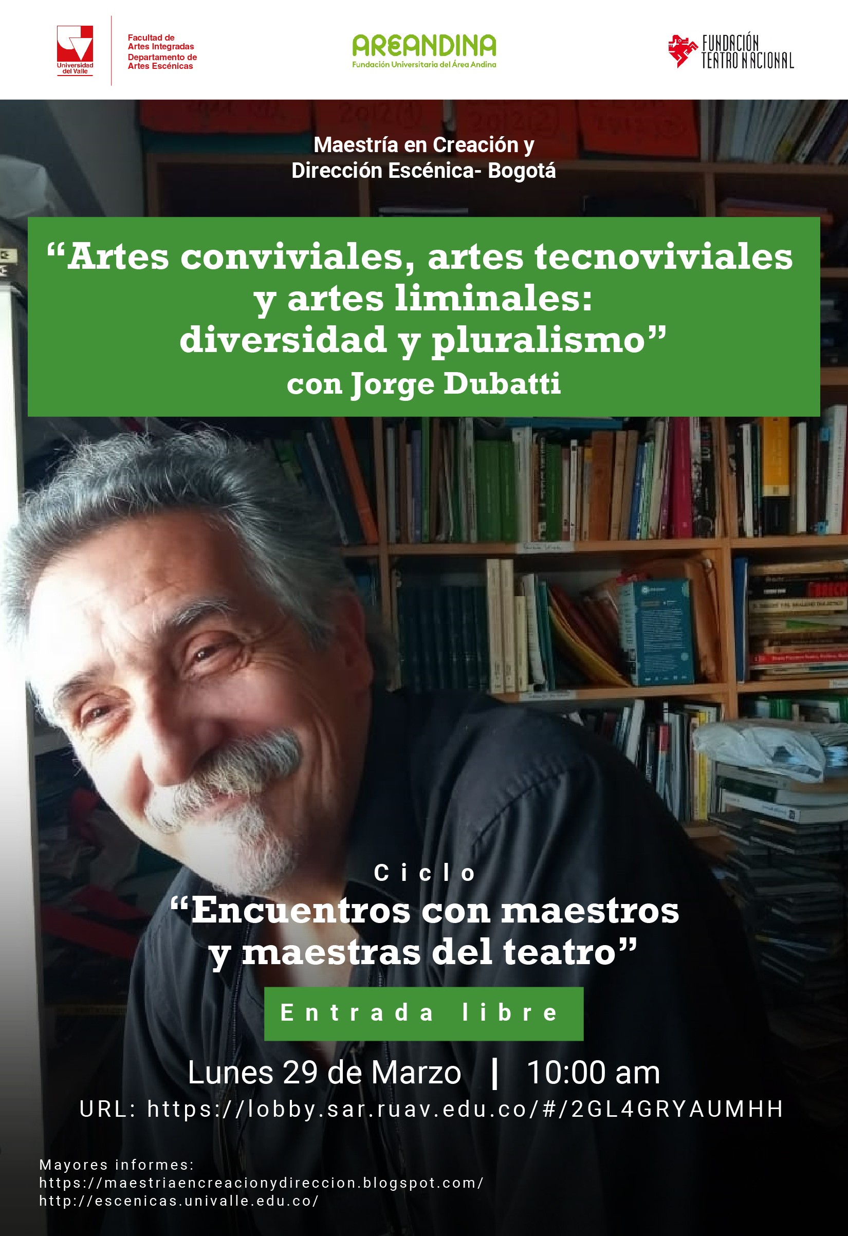 La Maestría en Creación y Dirección Escénica, Cohorte Bogotá, adscrita al Departamento de Artes Escénicas de la Facultad de Artes Integradas, continúa el ciclo denominado “encuentros con maestros y maestras del teatro”, en el 2021, abierto a la comunidad universitaria y académica, en el que participan los docentes invitados. El siguiente encuentro tendrá como protagonista al maestro argentino Jorge Dubatti, quien disertará sobre el tema: “Artes conviviales, artes tecnoviviales y artes liminales: diversidad y pluralismo”.