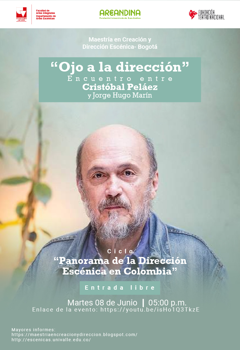 La Maestría en Creación y Dirección Escénica, Cohorte Bogotá, adscrita al Departamento de Artes Escénicas, con el apoyo de la Oficina de Extensión de la Facultad de Artes Integradas, continúa con el ciclo denominado “Panorama de la Dirección Escénica en Colombia”, abierto a la comunidad universitaria y académica, en el que participan directores escénicos cuya destacada trayectoria es explorada por los maestrandos. El próximo encuentro, transmitido por el canal de YouTube de la Maestría, contará con la participación especial del maestro Cristóbal Peláez, director del Colectivo Teatral Matacandelas, quien mantendrá un encuentro con el maestrando Jorge Hugo Marín, el martes 8 de junio del 2021 a las 5:00 p.m