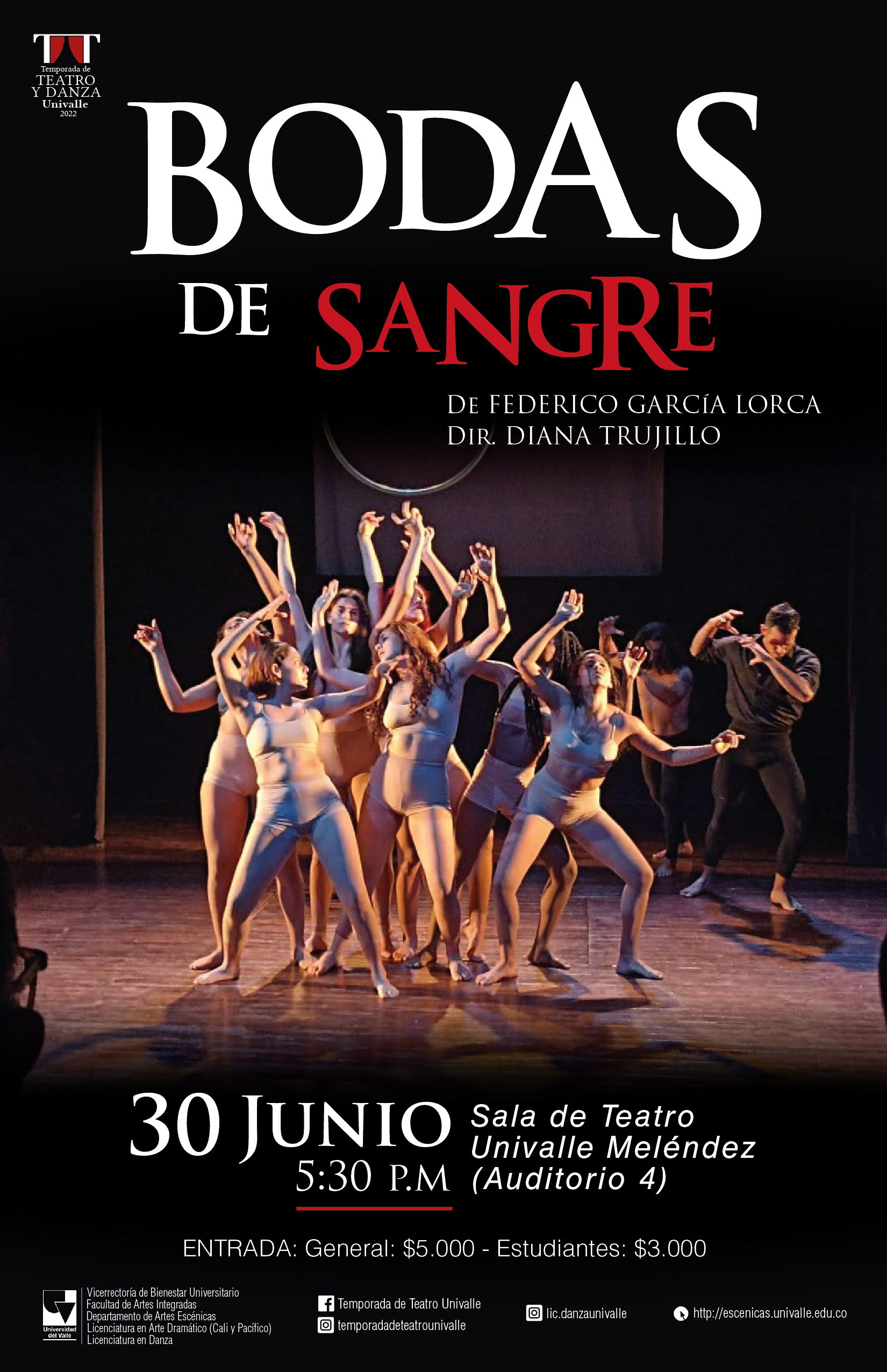 La Temporada de Danza y Teatro Univalle presenta Bodas de sangre en un performance corporal, a cargo de los estudiantes de quinto semestre de la Licenciatura en Arte Dramático, bajo la dirección de Diana Trujillo. La función tendrá lugar el jueves, 30 de junio 2022 en la Sala de Teatro Univalle (Auditorio IV).