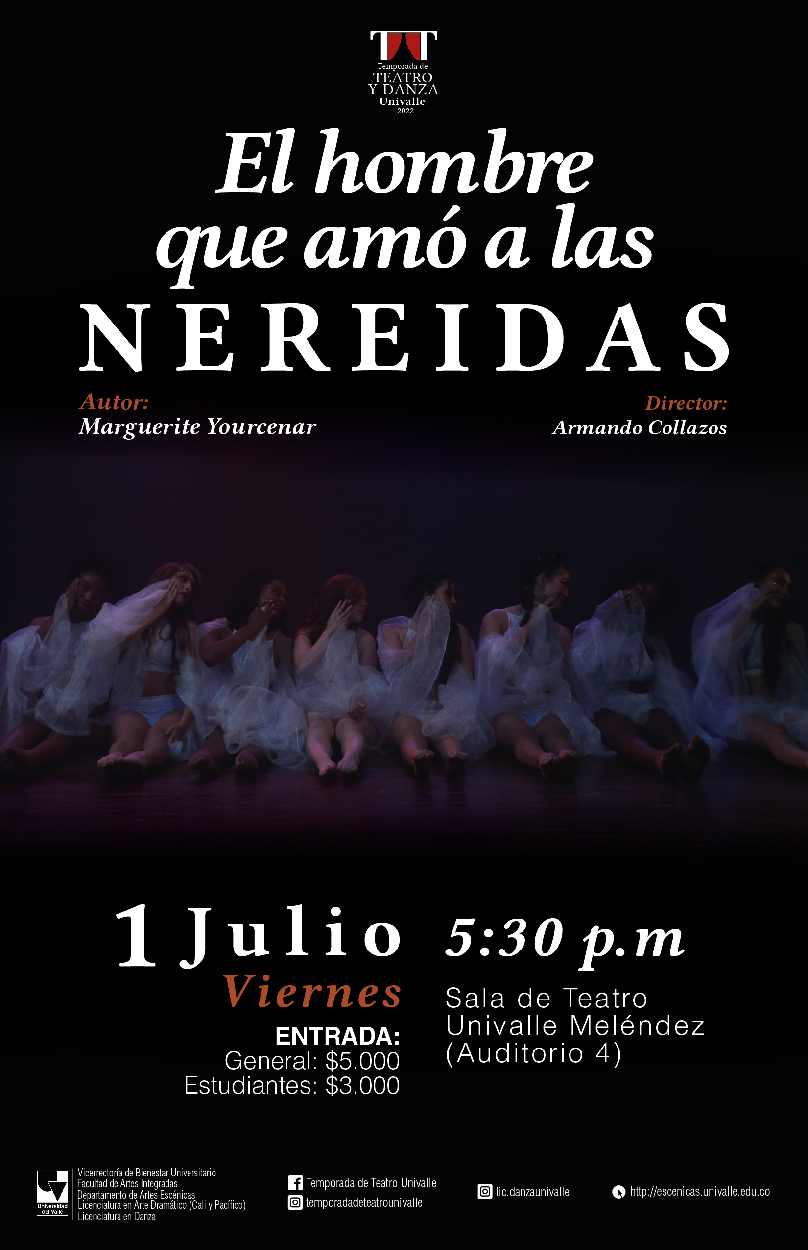 La Temporada de Teatro Univalle presenta El hombre que amó a las nereidas escrito por Marguerite Yourcenar. El montaje está a cargo por los estudiantes de quinto semestre de la Licenciatura en Arte Dramático y dirigido por Armando Collazos Vidal, Maestro del Departamento de Artes Escénicas. La función tendrá lugar el viernes 1 Julio del 2022 en el auditorio 4 a las 5:30 pm, solo tendrá una función.