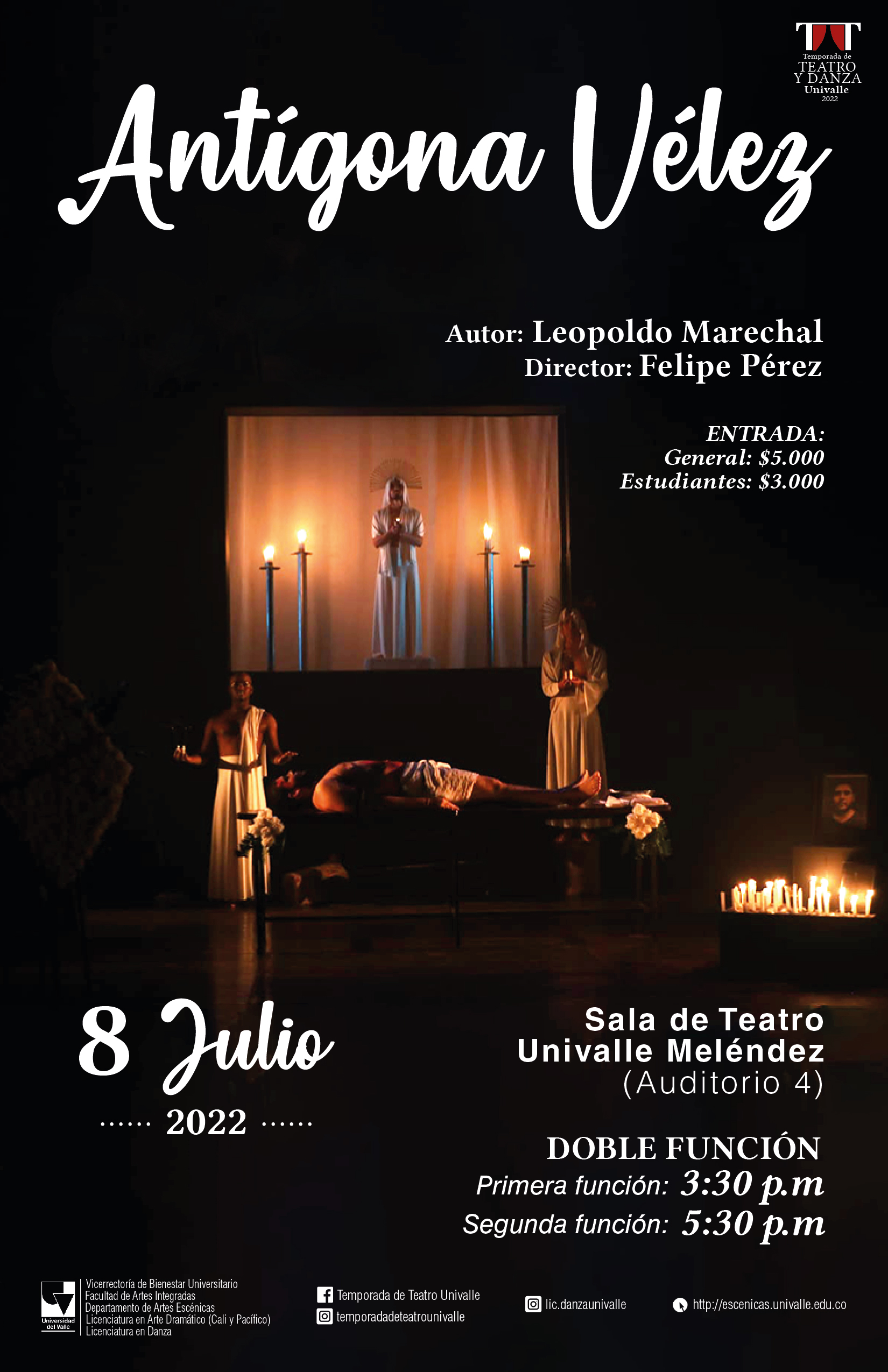La Temporada de Teatro y Danza Univalle 2022, presenta Antígona Vélez una adaptación del mito tradicional de Sófocles del dramaturgo Leopoldo Marechal, narrador, poeta, y ensayista argentino, vinculado inicialmente al vanguardismo para más tarde acercarse a la novela y un estilo más clásico.