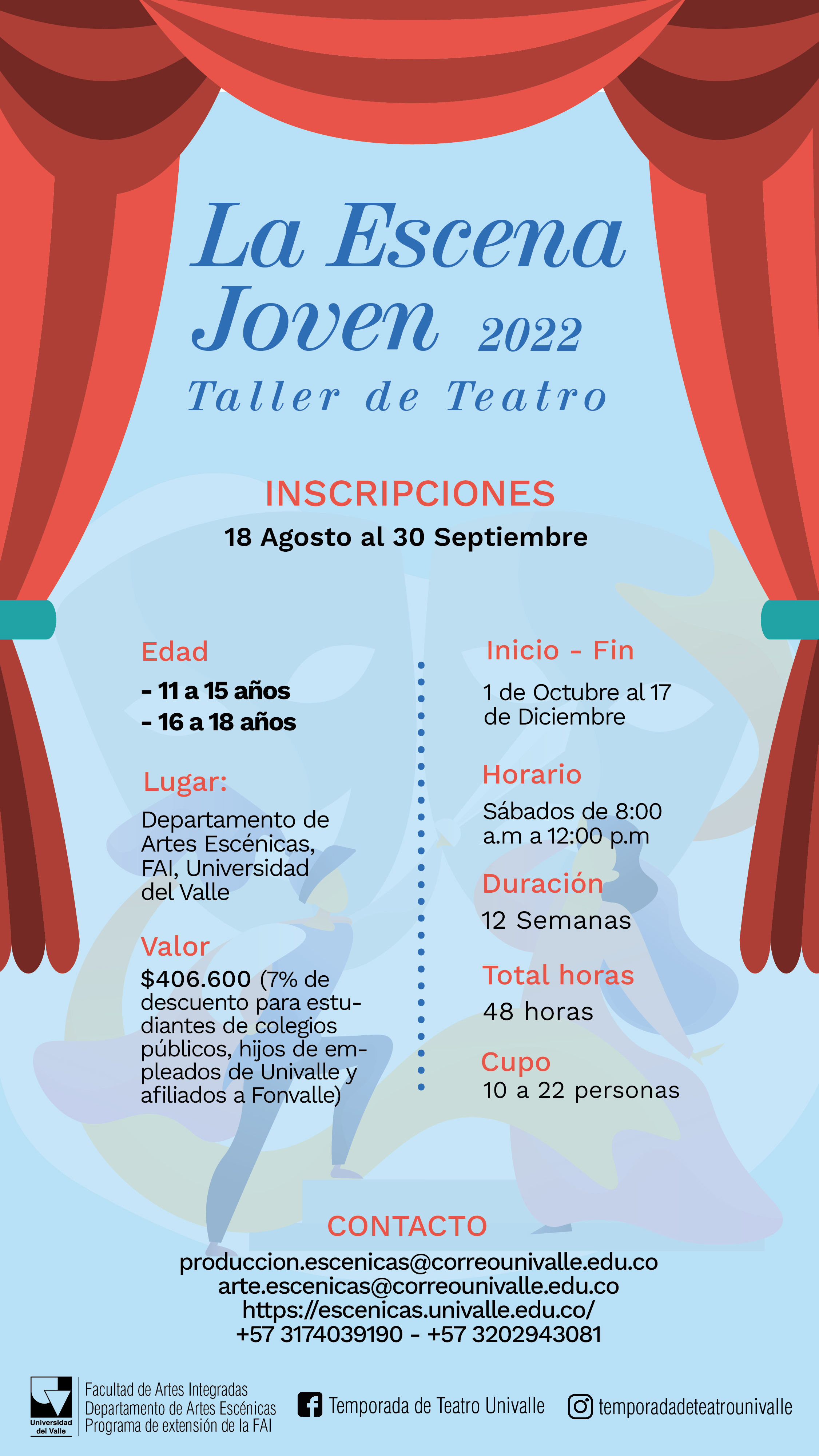 En La escena joven, el Departamento de Artes Escénicas de la Universidad del Valle, convoca a jóvenes entre los 11 y los 15 años para que descubran y disfruten los lenguajes artísticos puestos al servicio de sus capacidades creativas, interpretativas y explorativas.