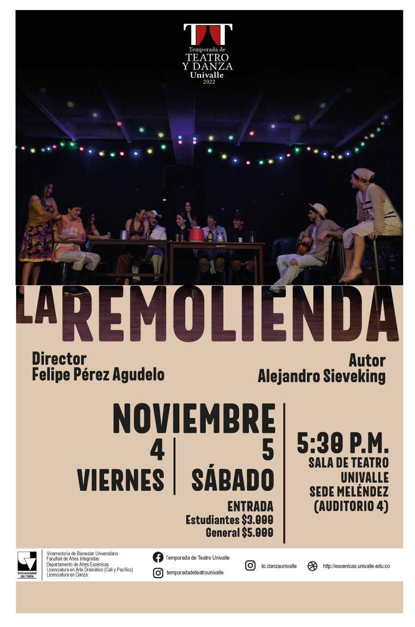 El Departamento de Artes escénicas de la Universidad del Valle sigue con la Temporada de Teatro con el estreno de la obra "LA REMOLIENDA - Una obra de amores campesinos", creada por el director Felipe Pérez Agudelo, Este espectáculo está a cargo de los estudiantes de octavo semestre de Licenciatura en Arte Dramático. La obra se presentará este viernes y sábado, 4 y 5 de noviembre a las 5:30 p.m. en la Sala de Teatro Univalle.