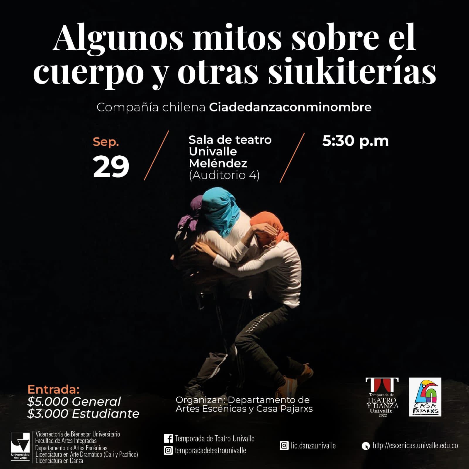 El Departamento de Artes escénicas de la Universidad del Valle presenta la obra de teatro internacional "Algunos mitos sobre el cuerpo y otras siutikerias" de la compañía de teatro chilena cíadedanzaconminombre. La obra se presentara este 29 y 30 de septiembre del 2022 a las 5:30 P.M. en la sala de Teatro Univalle.