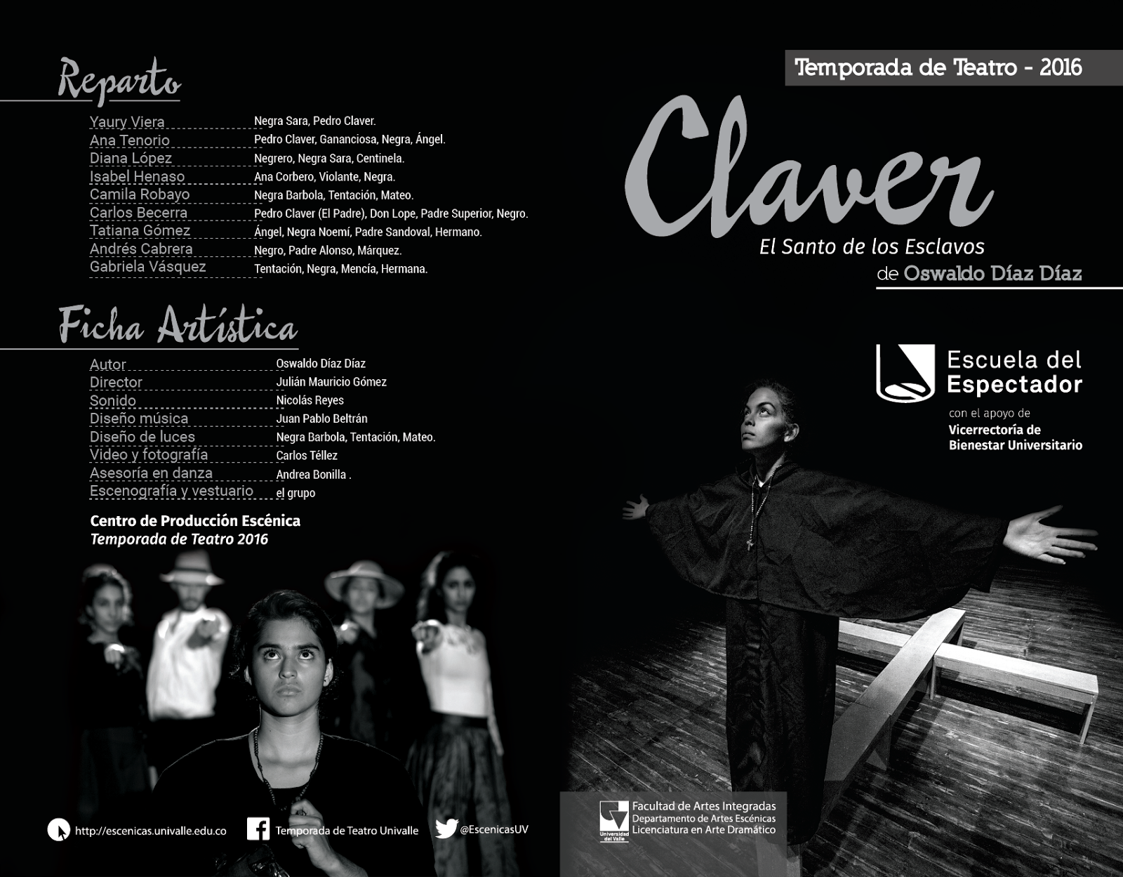 El Departamento de Artes Escénicas anuncia el estreno de “Claver” de Oswaldo Díaz Díaz, la historia del primer santo abanderado de los Afro en Colombia. El estreno tendrá lugar este viernes 18 y sábado 19 de septiembre, en la Sala de Teatro Univalle (Auditorio IV), a las 530pm.