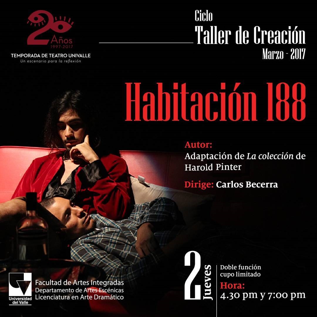 Carlos Becerra es estudiante de noveno semestre de Licenciatura en Arte Dramático. Ha participado en puestas en escena como Claver (2015) de Oswaldo Diaz Diaz, dirigida por Julian Mauricio Gómez, Canto de ballenas (2016) de Anthony Minghella, dirigida por Everett Dixon y Pentesilea de Heinrich von Kleist, dirigida por Alejandro González Puche. Para culminar su proceso actoral dentro del Taller de Creación, decide llevar a escena un espectáculo teatral, donde pretende entrelazar su proceso actoral con la experiencia en el mundo del modelaje. Como una exploración estética asume su primera obra Habitación 188, inspirada en la obra La colección de Harol Pinter.