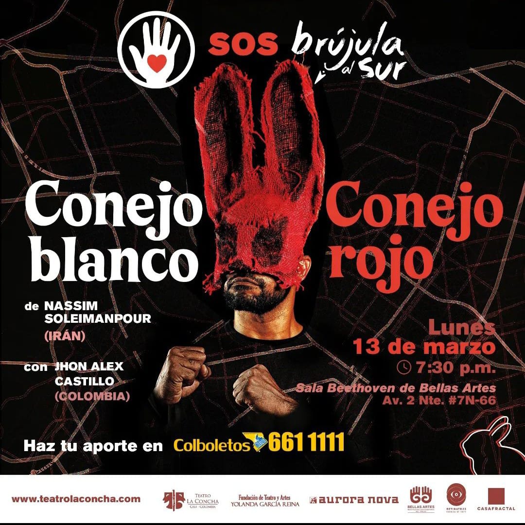 El Festival Brújula al sur realizara dos funciones de la obra Conejo blanco, conejo rojo del dramaturgo Nassim Soleimanpour como parte de su campaña SOS Brújula al Sur. Esta intrigante presentación será interpretada en simultaneo alrededor del mundo.
