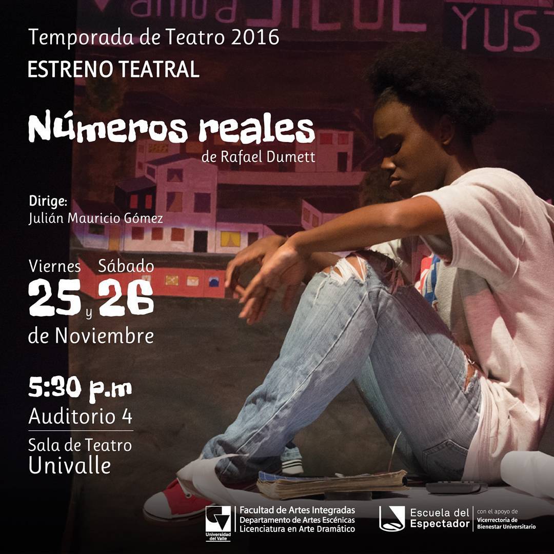 La Temporada de Teatro Univalle presenta el estreno de Números reales, obra perteneciente a la más reciente generación de autores peruanos contemporáneos, bajo la dirección de Julián Mauricio Gómez y ambientada en el tradicional barrio caleño de Siloé, como parte de la Temporada de Teatro Univalle este viernes 25 y sábado 26 de noviembre, en la Sala de Teatro Univalle (Auditorio 4), a las 5:30 pm.