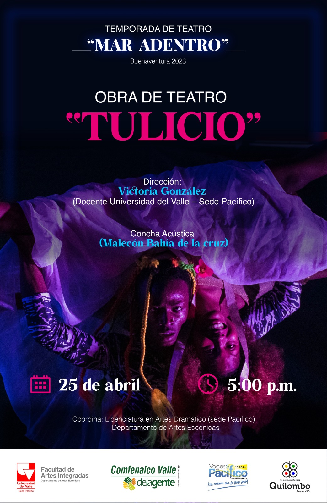El Departamento de Artes Escénicas anuncia el lanzamiento de la Temporada de Teatro en Buenaventura: Mar Adentro con el estreno de Tulicio, creación colectiva de teatro físico dirigida por Victoria González, este martes 25 de abril a las 5:00 p.m. en la Concha Acústica del Malecón Bahía de la Cruz