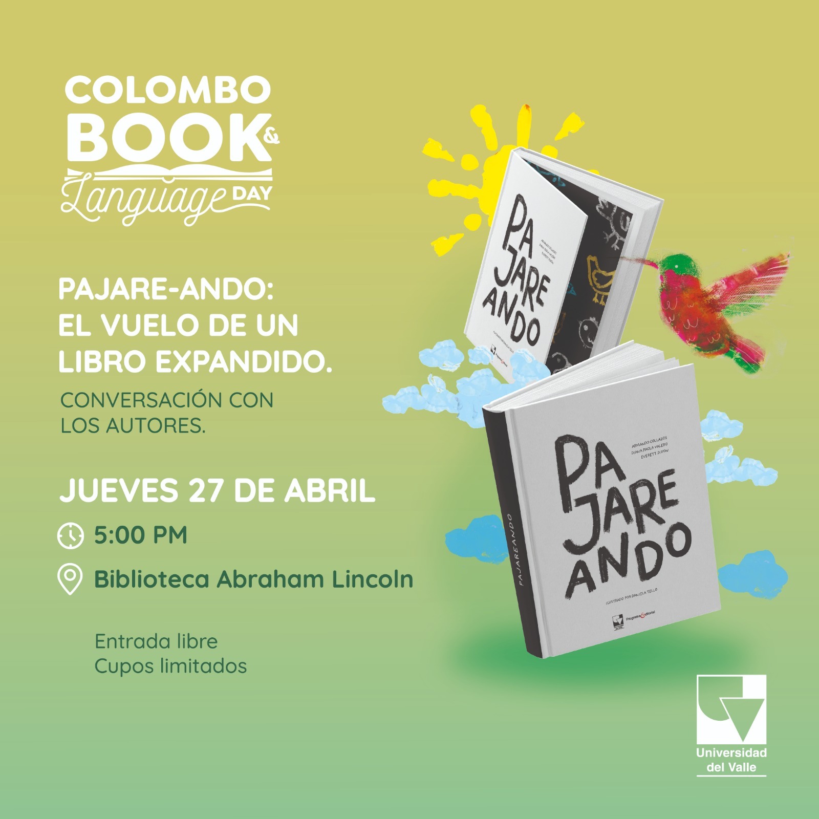 Es con placer que el Departamento de Artes Escénicas, el Departamento de Diseño y el grupo de investigación Voces del Cuerpo invita a la comunidad universitaria a un conversatorio con los profesores Armando Collazos y Diana Valero sobre el libro Pajareando, ad portas de publicarse, este jueves 27 de abril de 2023 a las 5 pm en la Biblioteca Abraham Lincoln en el Centro Cultural Colomno-Americano (Calle 13N # 8N - 45 Barrio Granada).