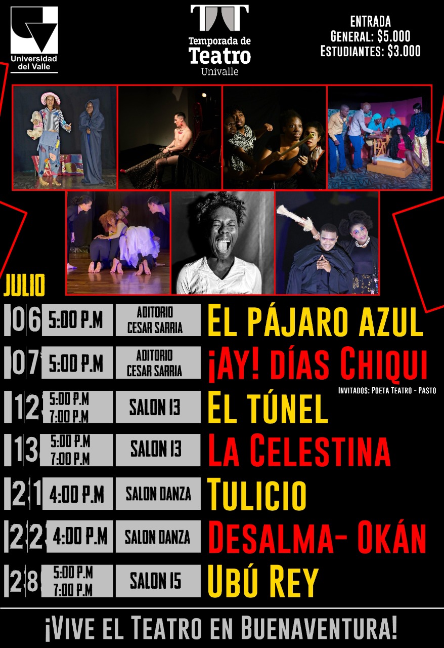 En esta versión tendremos la oportunidad de ver la arriesgada puesta en escena de ¡Ay! Días Chiqui, un clásico del teatro colombiano, llevado a escena por el grupo “Poeta Teatro” de la ciudad de Pasto. Para los amantes de la danza les tendremos “Desalma Okán” el último estreno del grupo representativo de Danza Contemporánea de la Universidad del Valle sede Pacífico "Contempo Pacífico", y así mismo estará “Tulicio” una fábula narrada desde el cuerpo por estudiantes de quinto semestre. Estas y muchas historias más podrán disfrutar en esta temporada ¡No falten, los cupos son limitados! ¡Todas las funciones serán en las instalaciones de la Universidad del Valle sede Pacífico!