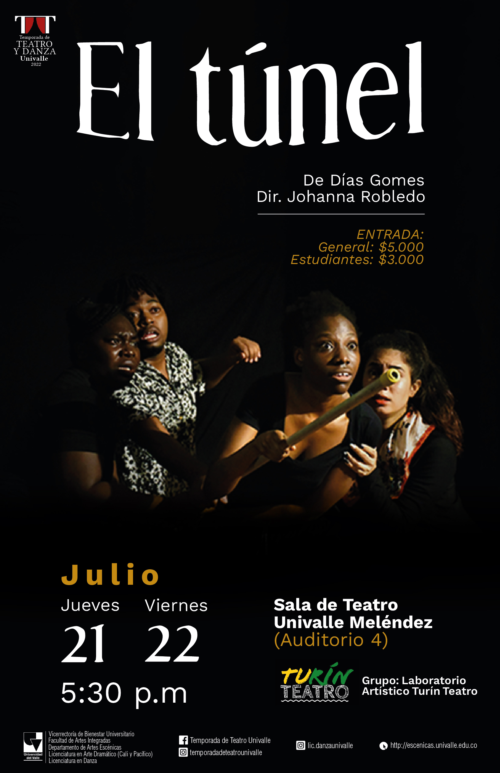 Con el ánimo de seguir impulsando el talento de las y los jóvenes de Buenaventura y de mostrarle a la comunidad bonaverense la variedad artística de nuestra región, la Licenciatura en Arte Dramático de la Universidad del Valle sede Pacífico, gracias al apoyo de las directivas universitarias de nuestra sede, nuevamente unen fuerzas para esta nueva versión de la “TEMPORADA DE TEATRO EN BUENAVENTURA”, un evento que resalta lo mejor del arte escénico de nuestra tierra y que pretende ser referente cultural de la región.