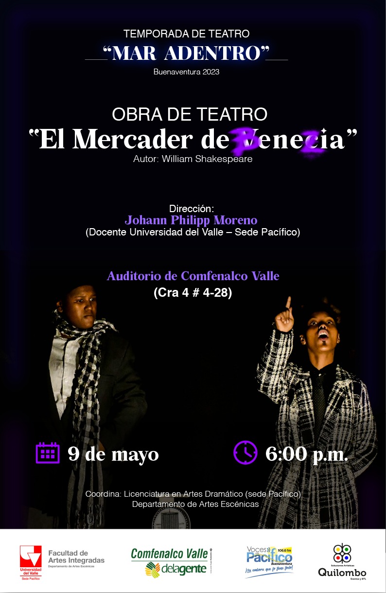 La Temporada de Teatro en Buenaventura "Mar Adentro" sigue con la obra "El Mercader de Venecia" de William Shakespeare, dirigida por el maestro Johann Philipp Moreno, el próximo martes 9 de mayo, el teatro regresa al Auditorio Comfenalco con la cita será a las 6:00 p.m.