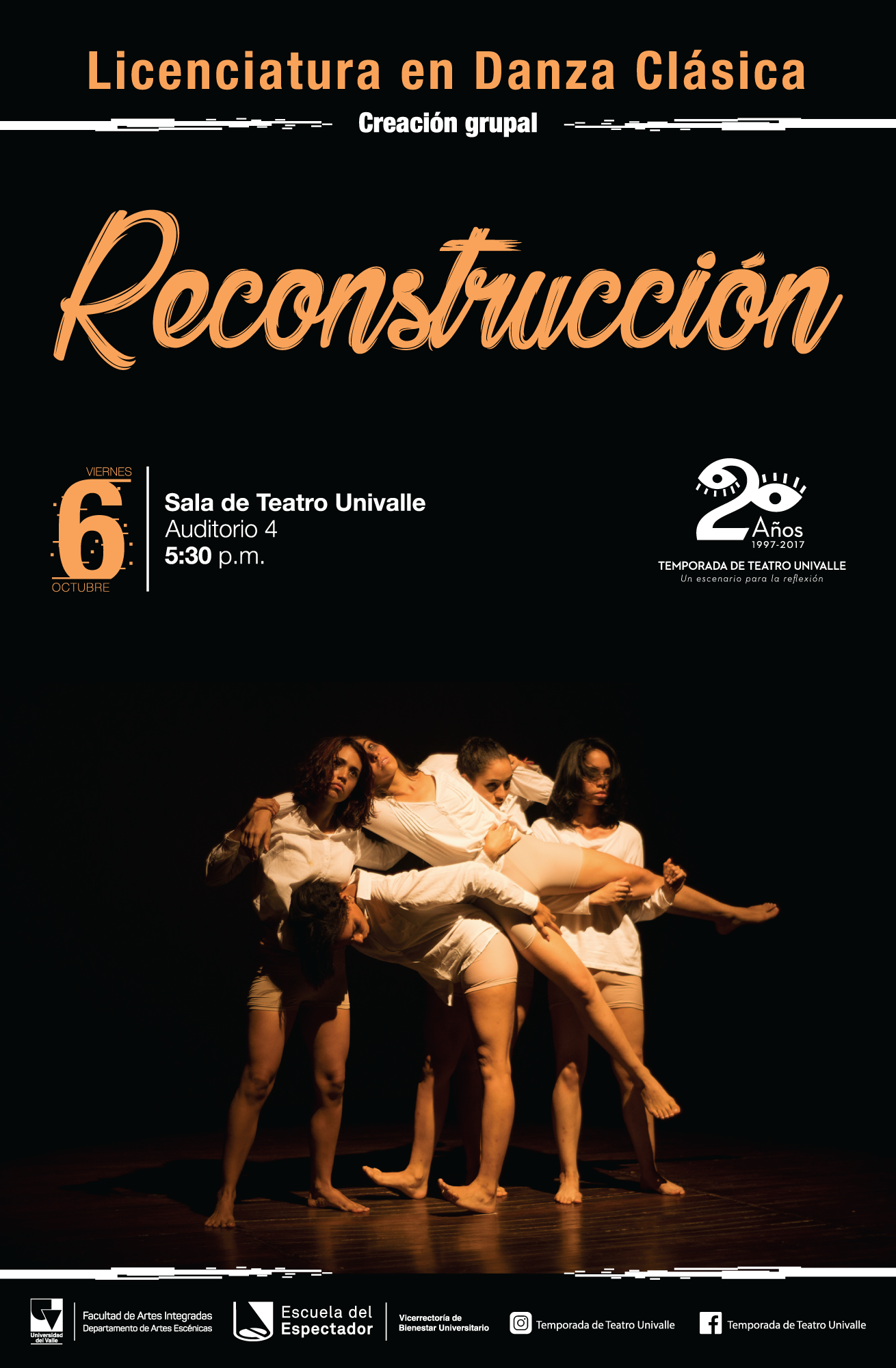 La Temporada de Teatro Univalle, 20 años, presenta la obra Reconstrucción, creada por estudiantes del programa de Licenciatura en Danza Clásica, en una única función que se llevará a cabo el viernes 6 de octubre a las 5:30 pm, en la sala de Teatro Univalle.