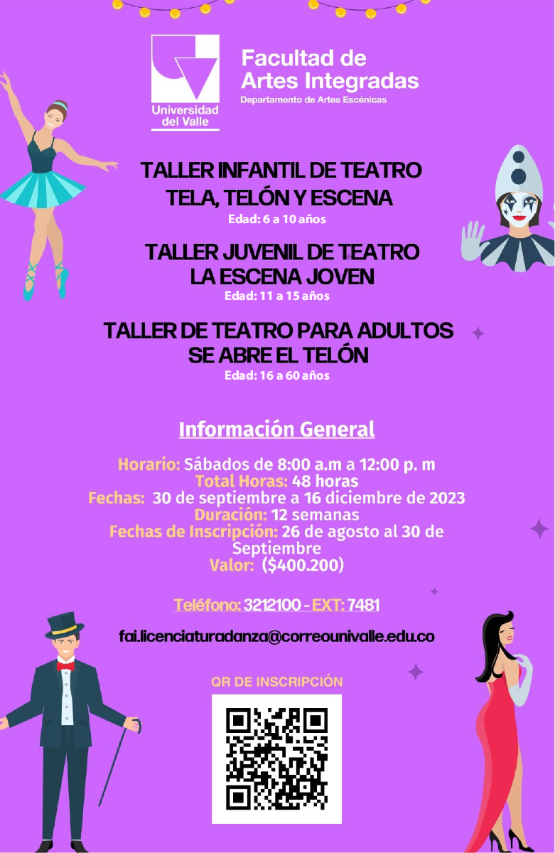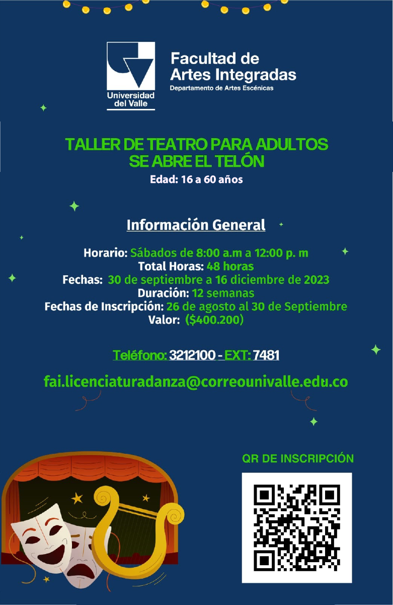 Recopilación de Talleres de Teatro dictados por el departamento de Artes Escénicas de la Universidad del Valle. Destinado a ser un espacio sensitivo y educativo, así como recreacional, para edades desde los 6 hasta 60 años.