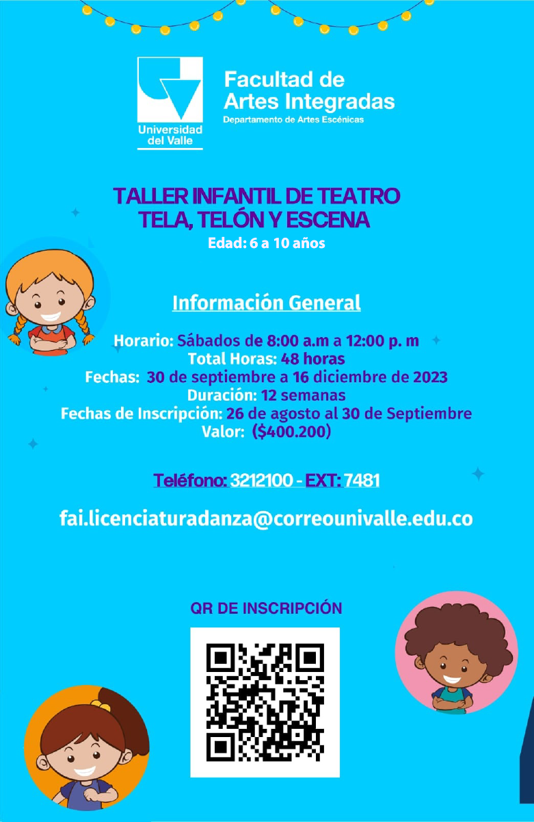 Diseñado para niños entre los 6 y los 10 años en Tela, telón y escena los niños descubrirán y disfrutarán los lenguajes artísticos e identificarán sus capacidades creativas, descubriendo aspectos insospechados de su cuerpo y mente.
