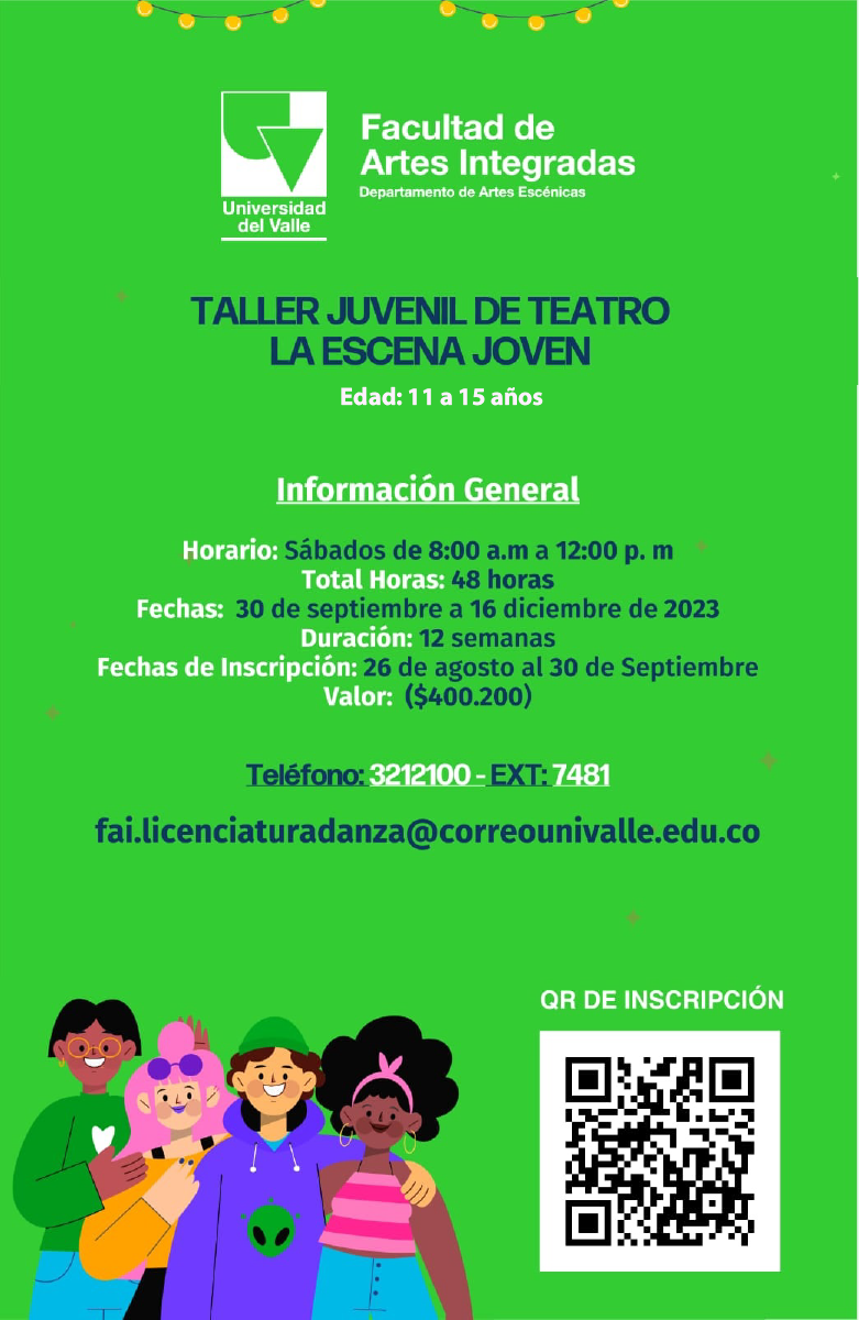 En La escena joven, el Departamento de Artes Escénicas de la Universidad del Valle, convoca a jóvenes entre los 11 y los 15 años para que descubran y disfruten los lenguajes artísticos puestos al servicio de sus capacidades creativas, interpretativas y explorativas. Guiados por el docente, los participantes recibirán una serie de herramientas básicas del entrenamiento teatral (físico, vocal e interpretativo) que contribuirán a descubrir aspectos insospechados de su cuerpo y mente