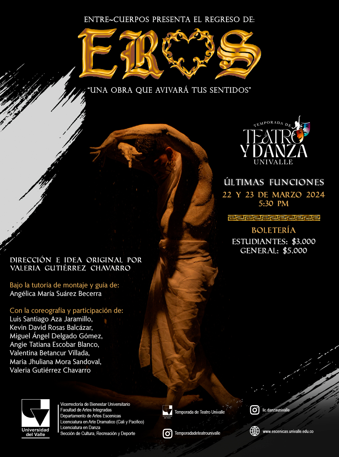 El colectivo de danza Entre Cuerpos te invita a sus últimas funciones de su más reciente producto creativo Eros, una obra de danza que avivará tus sentidos este viernes 22 y sábado 23 de marzo en la Temporada de Teatro y Danza de la Universidad del Valle. Las funciones tendrán lugar en la Sala de Teatro Univalle (Auditorio IV) a las 5:30 pm.