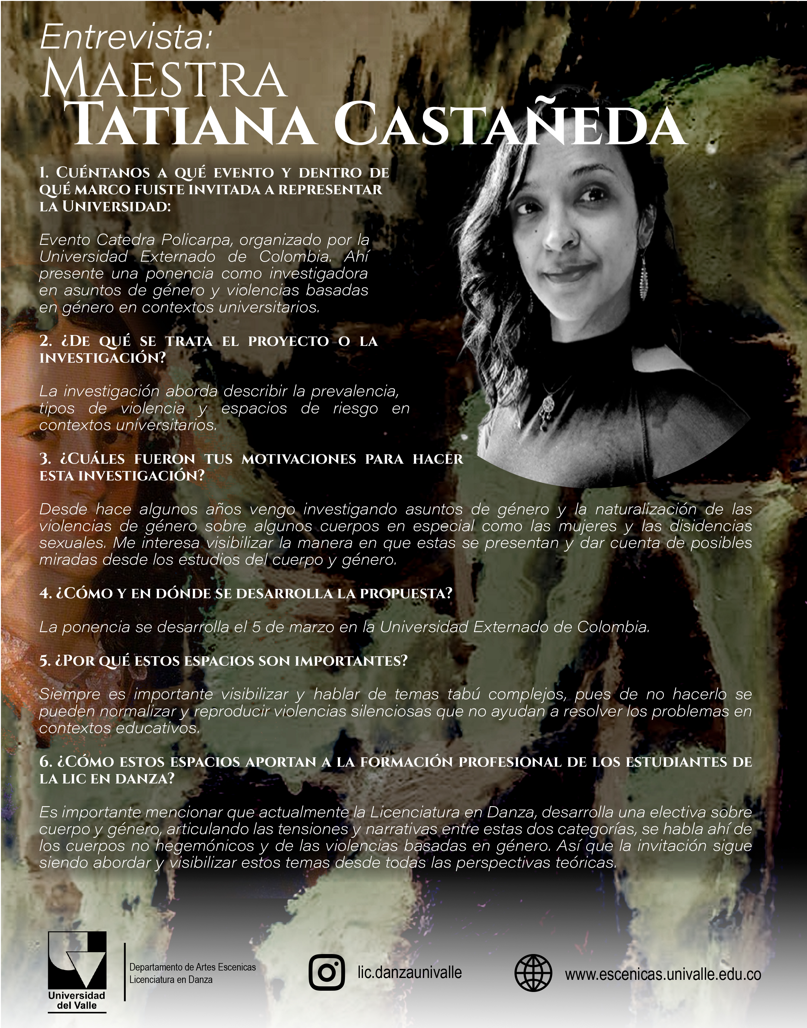 Docente - investigadora universitaria. Magíster en Educación desde la Diversidad; Especialista en Estudios de Género, Trabajadora Social y profesora de danzas con énfasis en ballet clásico y Folclor, egresada del Instituto Popular de Cultura, con excelentes capacidades comunicativas, de liderazgo y de trabajo en equipo. Mi experiencia profesional ha estado centrada en la construcción de programas educativos, sociales y culturales, fortaleciendo capacidades para la participación social, intervención e investigación social y artística. Gestora comunitaria y cultural, con habilidades de negociación y de trabajado como consultora técnica en la gestión de planes y estrategias con gobiernos locales, especialmente para la garantía de los derechos de personas en situación de discapacidad, niños, niñas, adolescentes y mujeres desde un enfoque diferencial y de género. Bailarina y productora cultural.