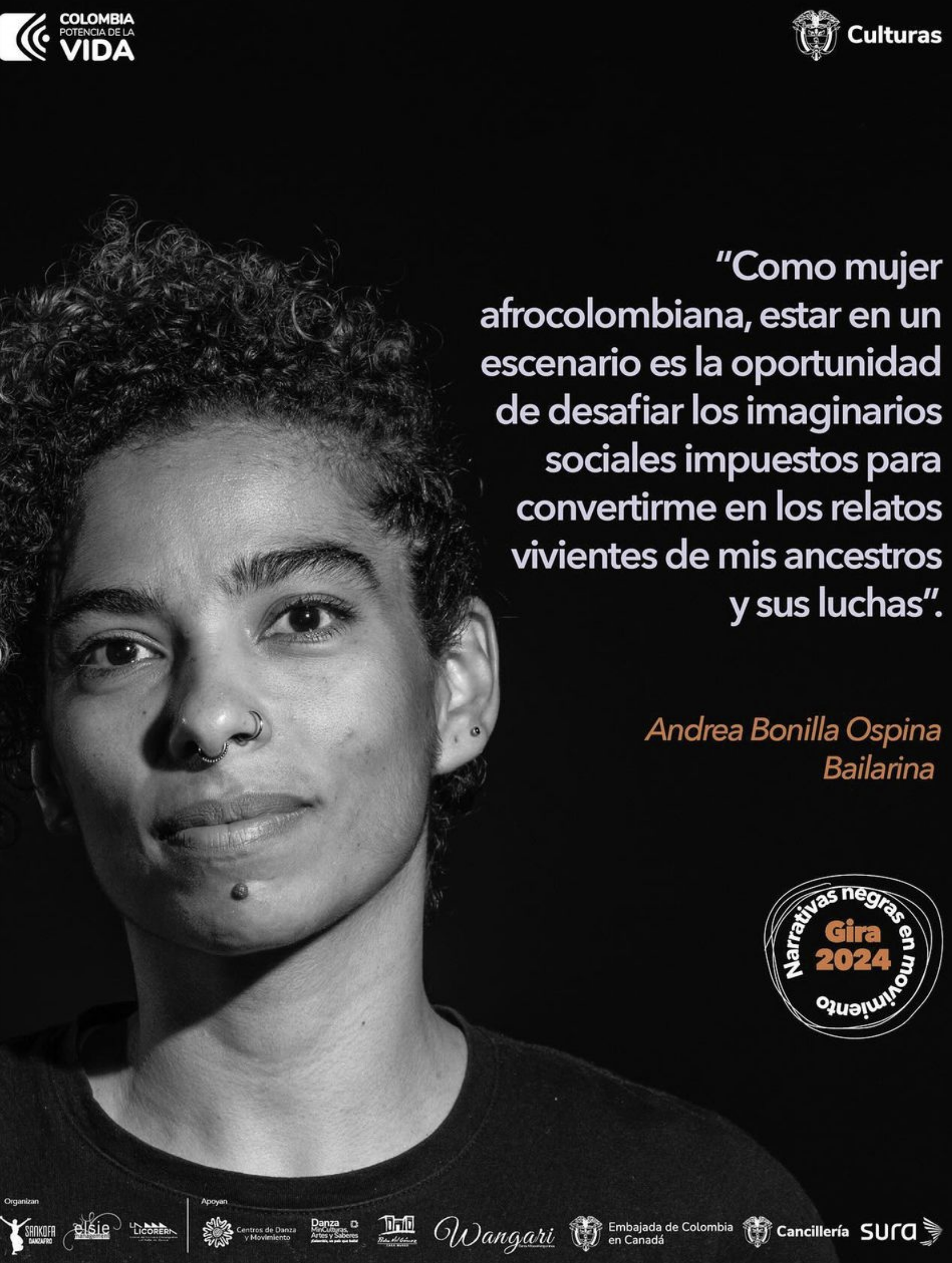 “Narrativas Negras en Movimiento.” Gira 2024 tiene como objetivo fomentar diálogos y fortalecer vínculos de la danza colombiana en escenarios internacionales, con la intención de divulgar el trabajo de la compañía. Con la obra “Detrás del Sur: Danzas para Manuel”, iniciaremos esta primera fase en Canadá, en los teatros Théatre Hector Charland, L' Assomption/ Grand Théatre de Québec, Québec y Théatre Maissonneuve, Montreal. Durante esta gira, la coordinadora de la Licenciatura en Danza, Andrea Bonilla, quien hace parte de la compañía Sankofa Danza Afro desde el 2005, estuvo representando a la Universidad del Valle en estos espacios llevando la danza a otras fronteras para ser escuchados y asumiendo la danza en unión con la música como enunciado afrodiaspórico que contradice los imaginarios de erotismo y exotismo, “sabor que se lleva en la sangre” para combatir estereotipos sobre los cuerpos y culturas negras.