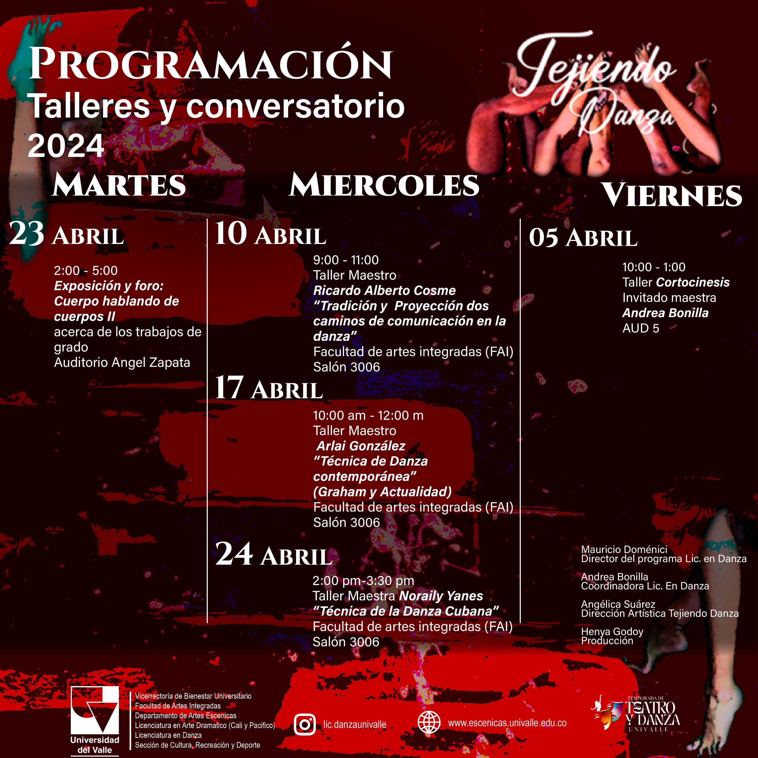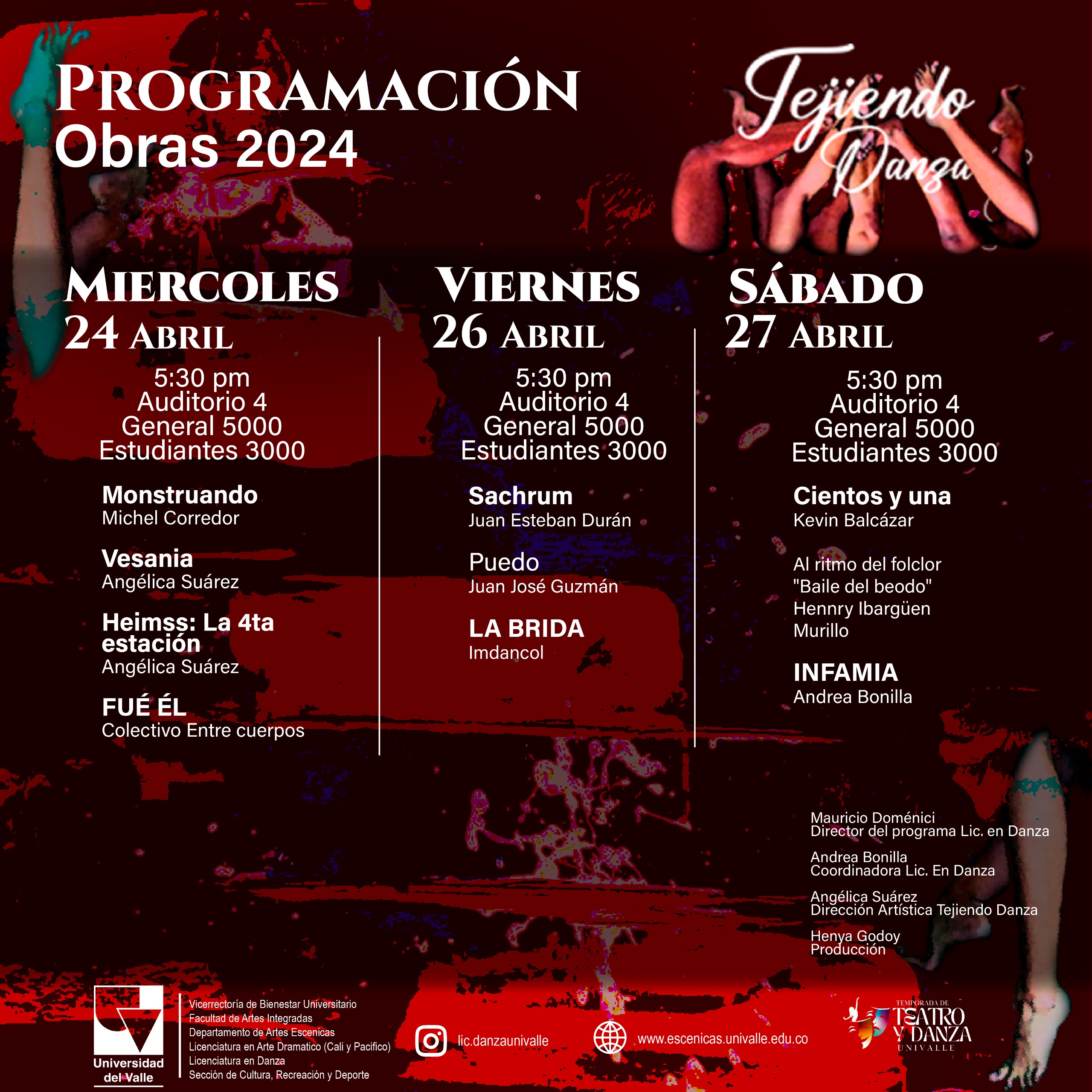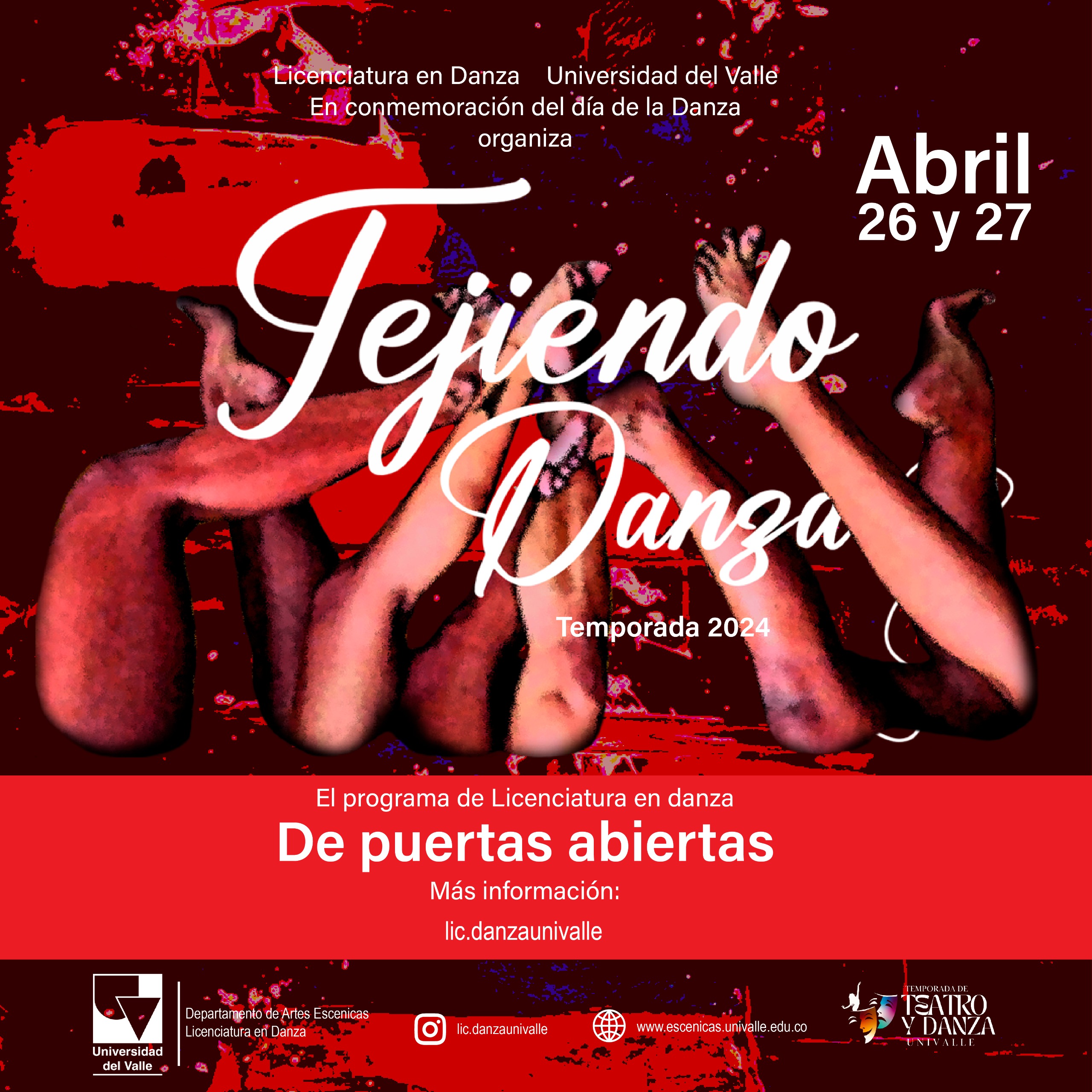 La conmemoración entorno al 29 de Abril día de la danza, surge hace 10 años en la Licenciatura en Danza, pero hace 3 años muta a 'Tejiendo Danza' , bajo la dirección de la coordinadora, Andrea Bonilla, y la producción general de Henya Godoy junto con el equipo de producción (Santiago Aza, Manuel López, Andrés Marín, Jhuliana Mora, Luna Folleco, Juan Manuel Geyco, Miguel Naspucil, Tatiana Morales, Isabela García, Karla Reyes, Jhangelys López, Ingrid Parra, Santiago Lozano, Daniel Pino y Tatiana Escobar).